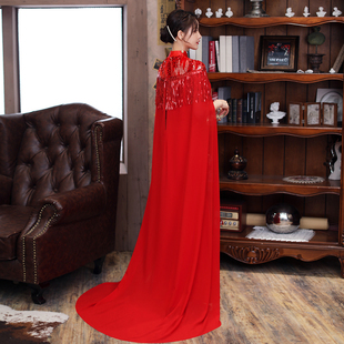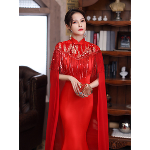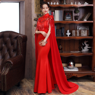 高端走秀旗袍长款 演出鱼尾裙主持人礼服女表演服中国风显瘦带披风