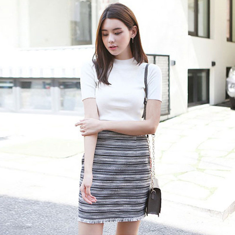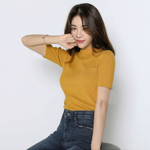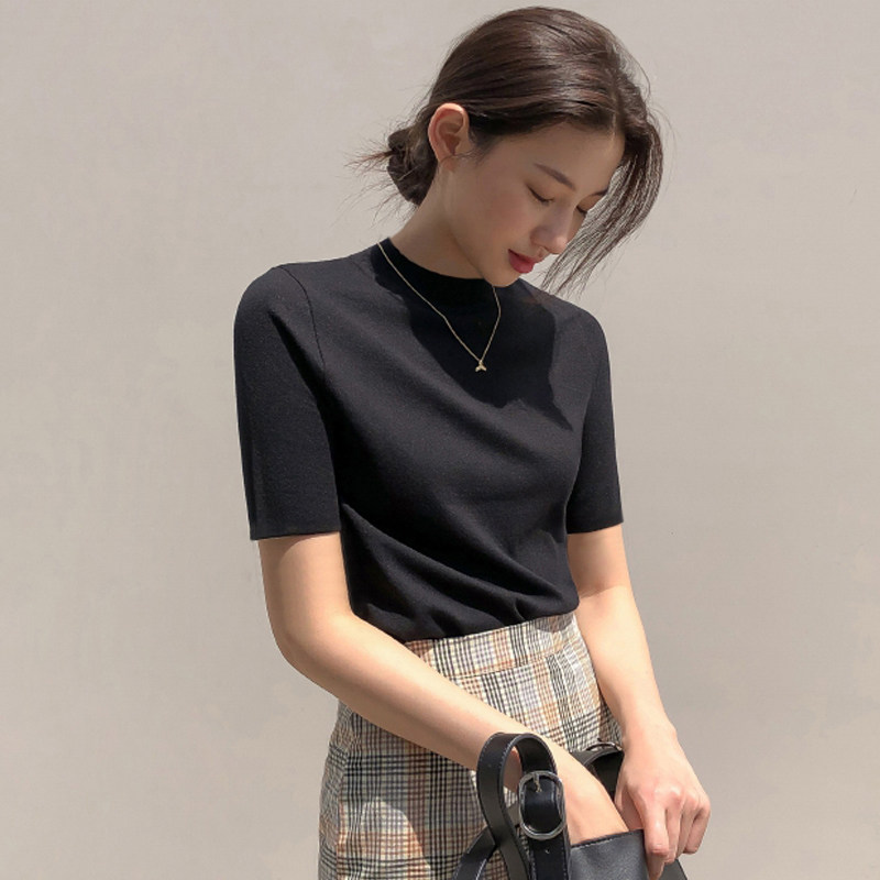 上衣女夏季 黑色打底衫 新款 t恤女薄款 潮 洋气半高领短袖 冰丝针织衫