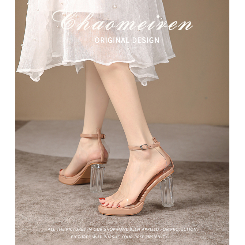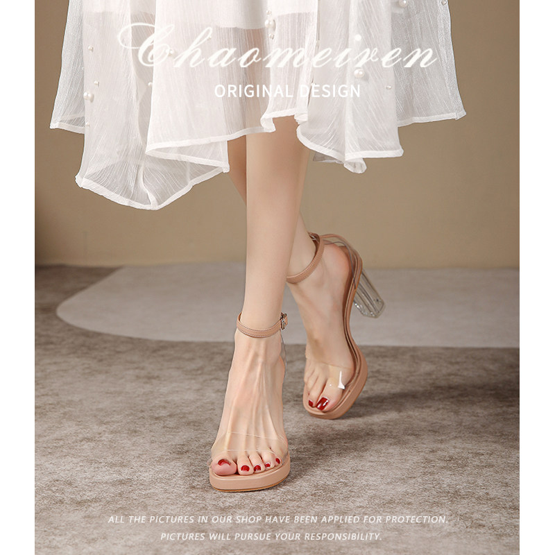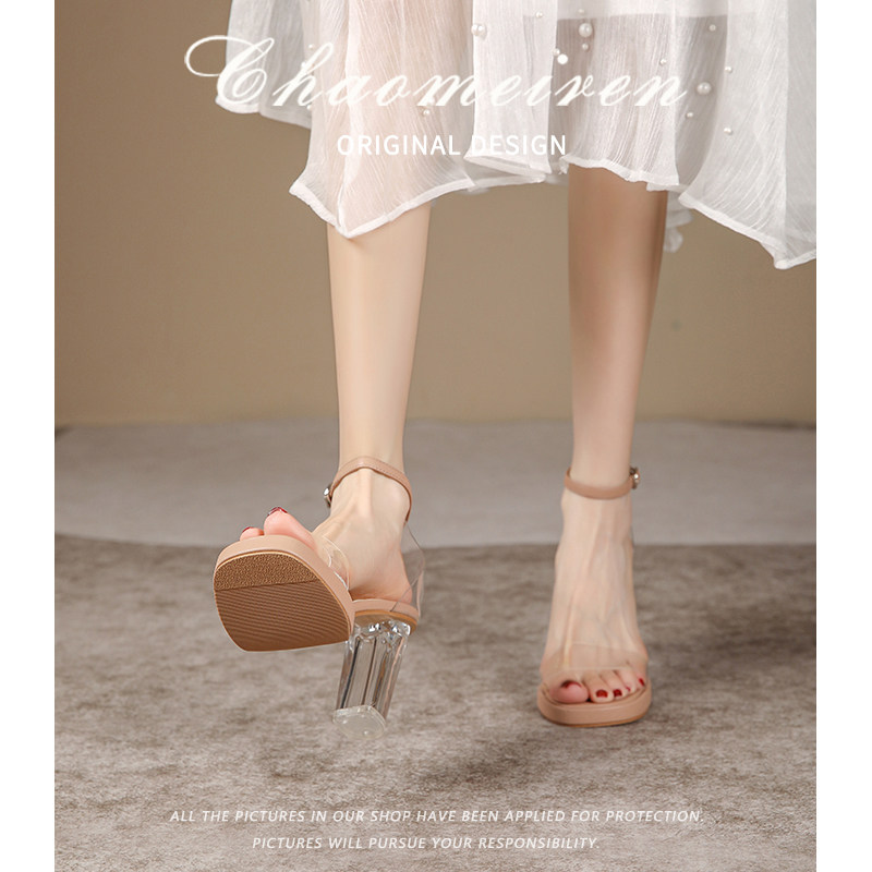 一字扣带网红仙女风粗跟高跟鞋 超高跟水晶鞋 女2025年新款 透明凉鞋