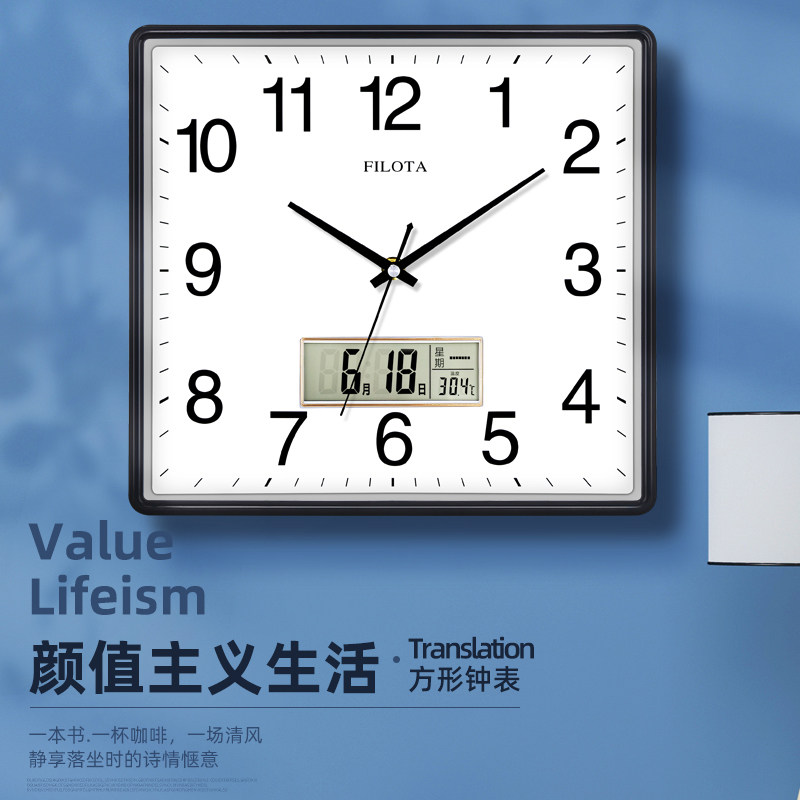 方形电子钟表挂钟客厅静音家用简约创意时尚 免打孔石英钟表挂墙上