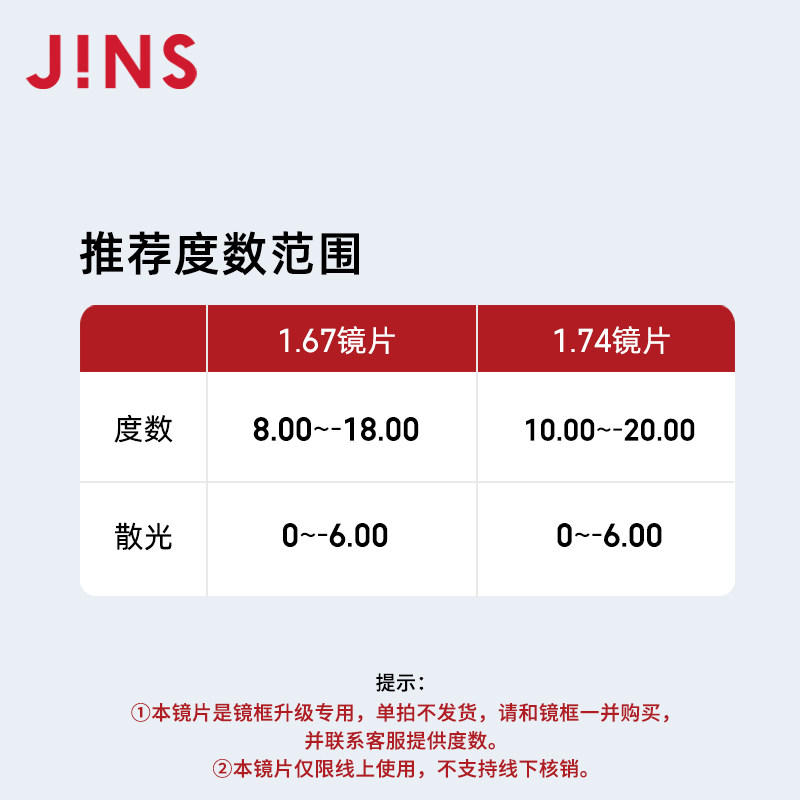 JINS睛姿近视眼镜升级 1.74轻晰真视双非防蓝光非球面镜片专用