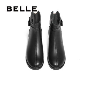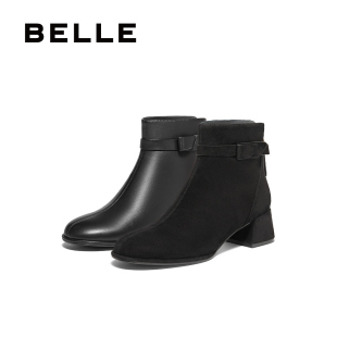 百丽女靴子新款 靴B9A1DDD4 超软羊皮粗高跟短靴加绒保暖黑色时装