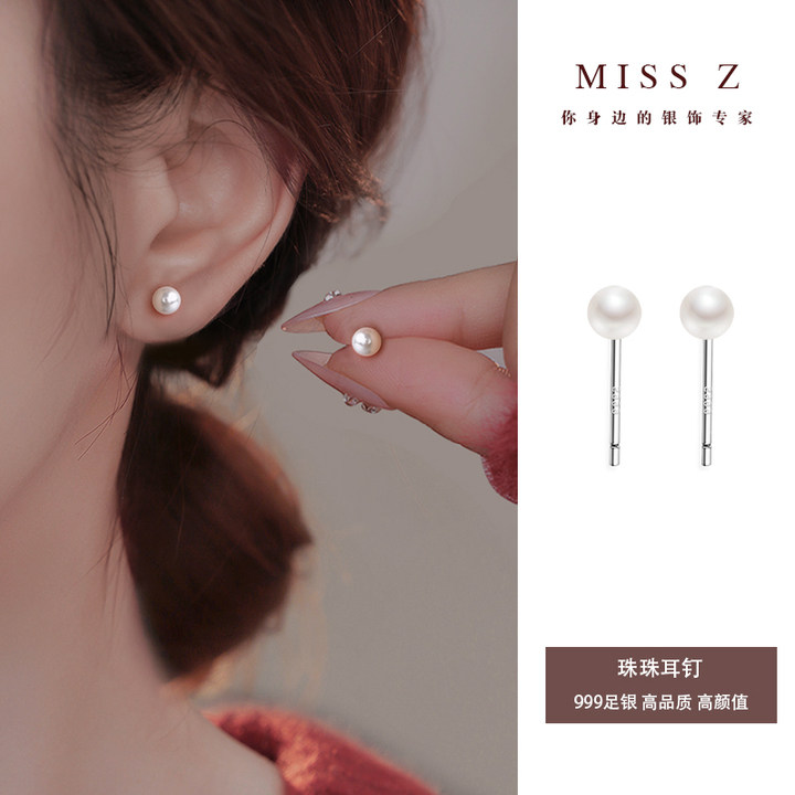S999纯银天然淡水珍珠耳钉养耳洞女睡觉免摘耳棒耳骨钉耳饰小耳环