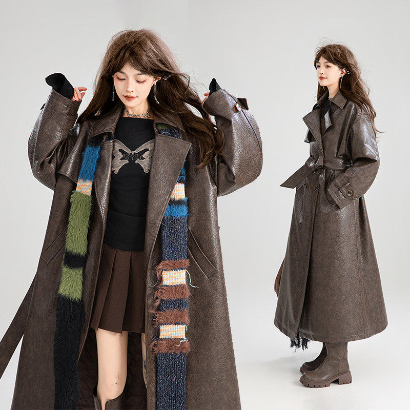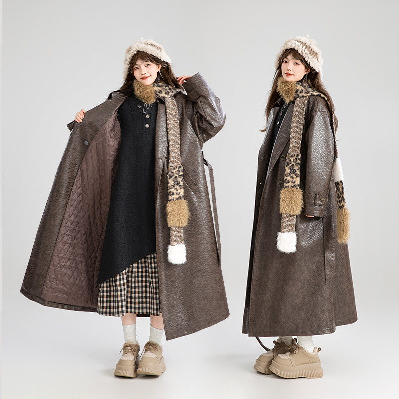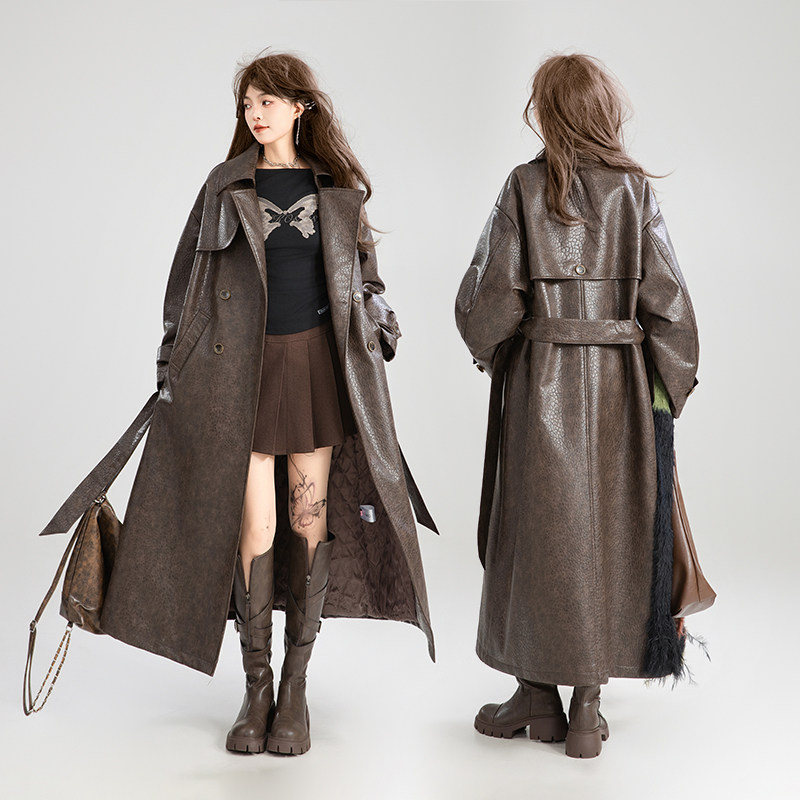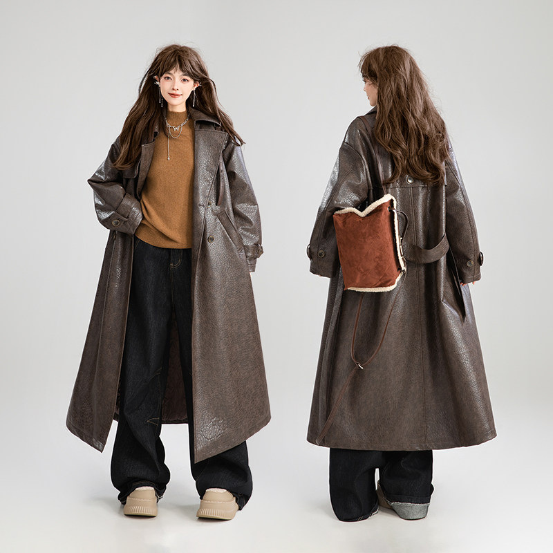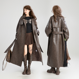 收腰翻领上衣 棕色皮衣外套女流行复古短款 DPLAY2025年冬季 新款