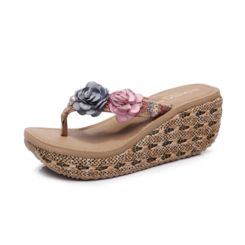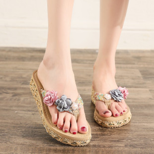 草编花朵人字拖女松糕高跟度假外穿夹脚花朵防滑拖鞋 2024夏季 新款