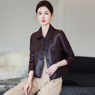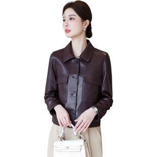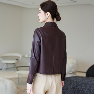时尚 高级绵羊皮中年长袖 翻领休闲外套春秋 海宁真皮皮衣女短款 新款
