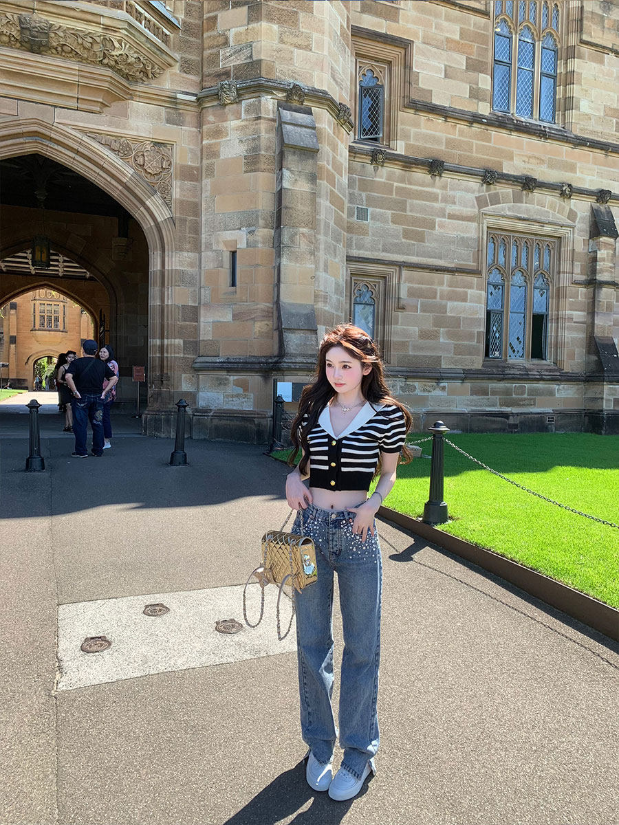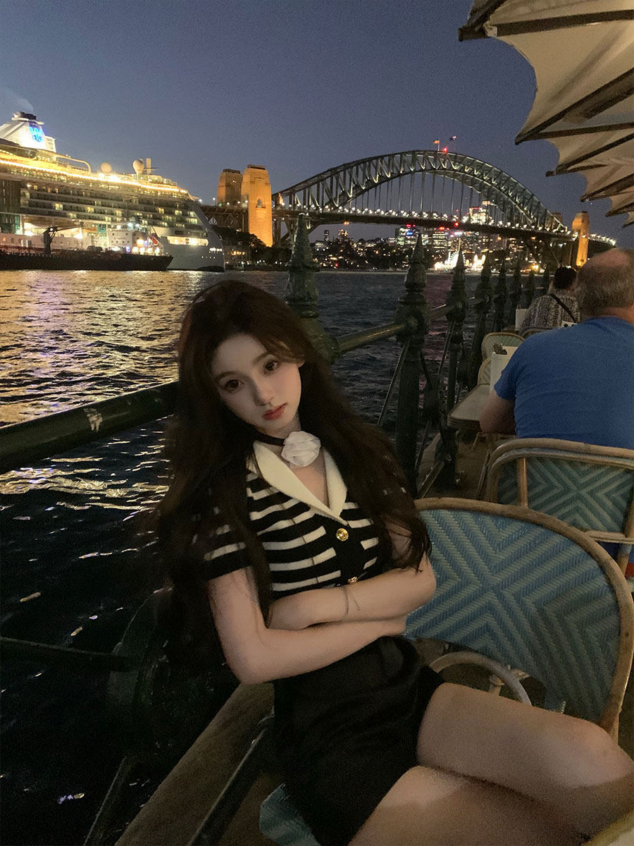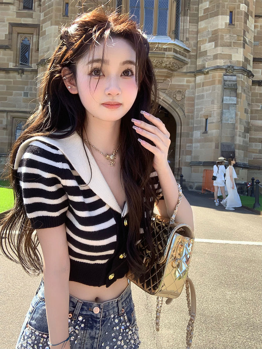 针织上衣条纹T恤女春夏新款 你 海军领短袖 清纯校花 懒懒llan