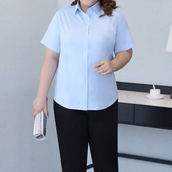 女职业装 蓝色衬衫 宽松衬衣工作服白色寸 短袖 200斤胖mm加肥加大码