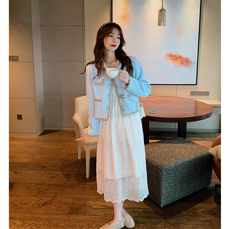 长裙白色仙女气质蕾丝长袖 配大衣 连衣裙秋冬 法式 欧洲站2023新款