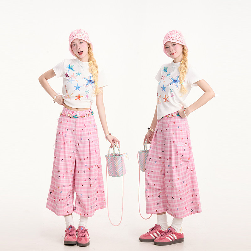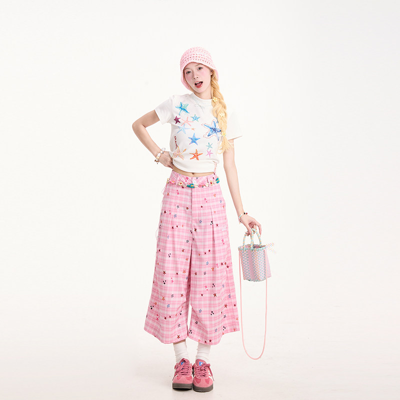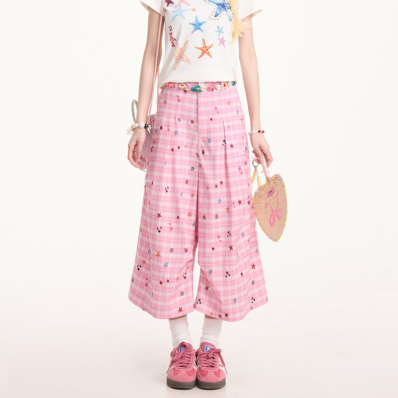 NERESUM彩色星星粉色格纹七分裤 女夏日多巴胺阔腿显瘦休闲短裤