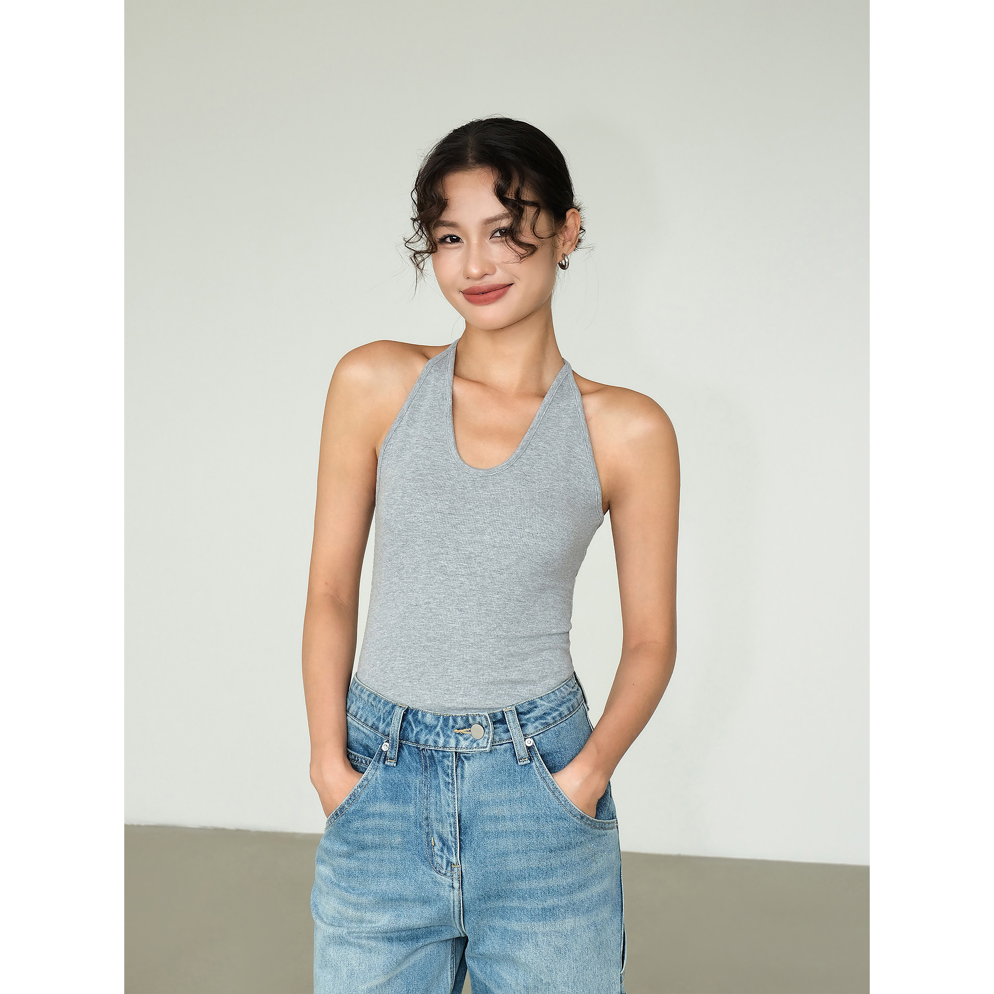 收腰背心 U型领挂脖吊带上衣女辣妹风纯欲修身 ousph 现货4折