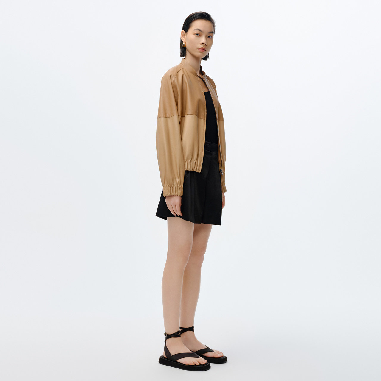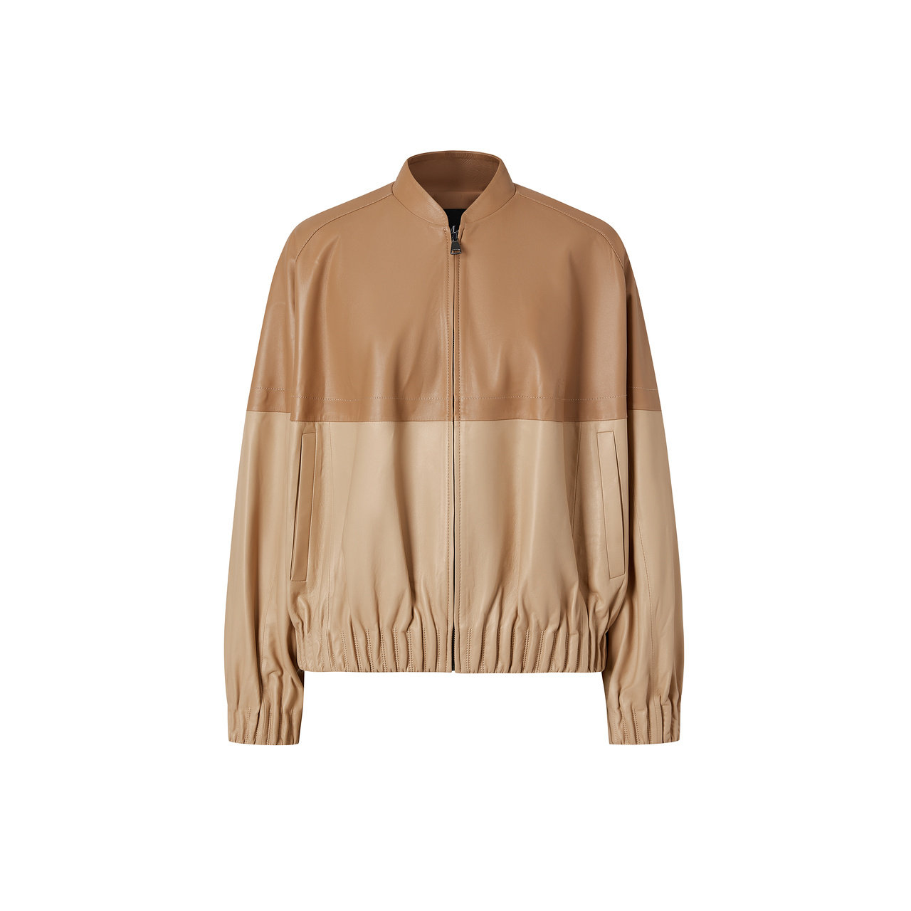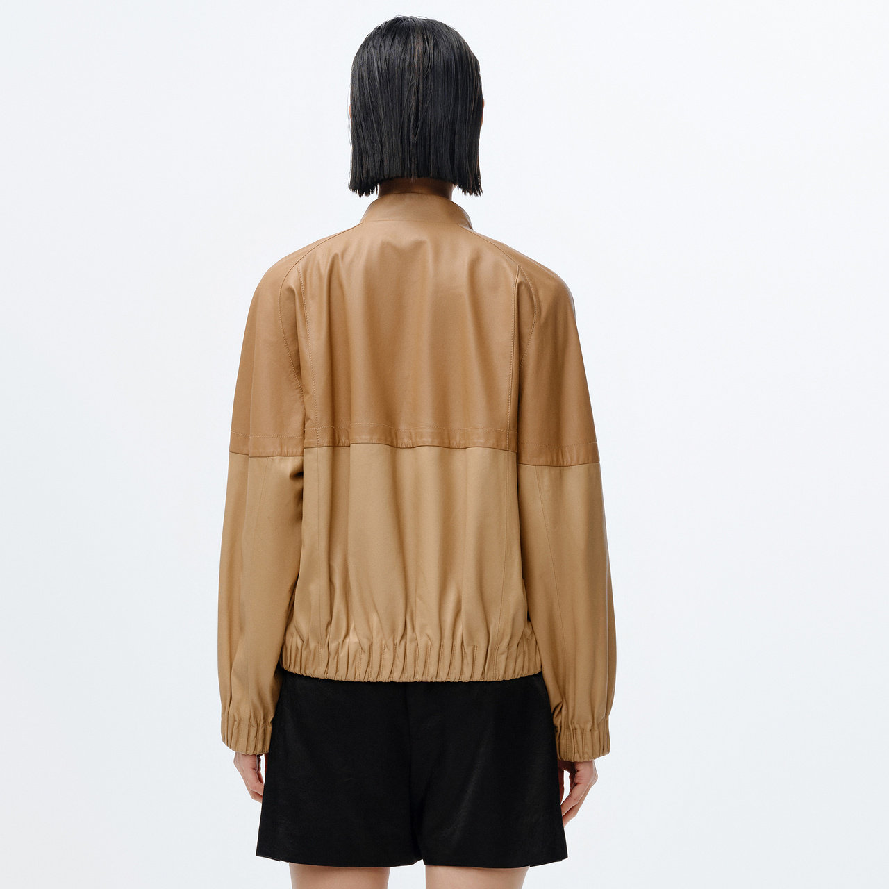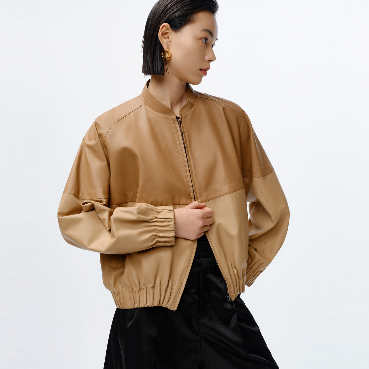 IMM尹默女装 绵羊皮革茧型包容性微撞色拼接连帽皮衣 春季