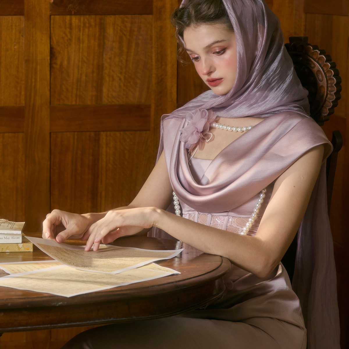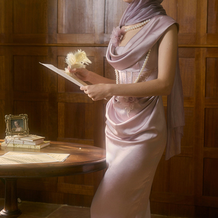 浪漫设计感重工紫色缎面光感鱼骨连衣裙夏 法式 LaceMade 时光恋人