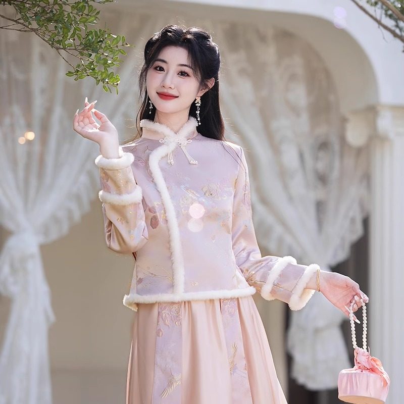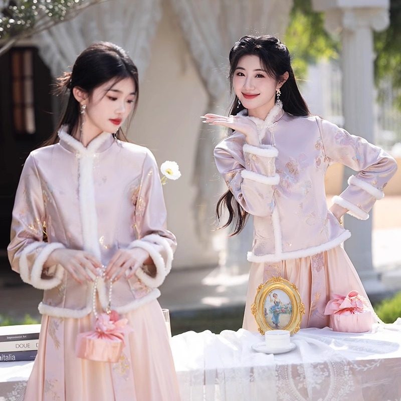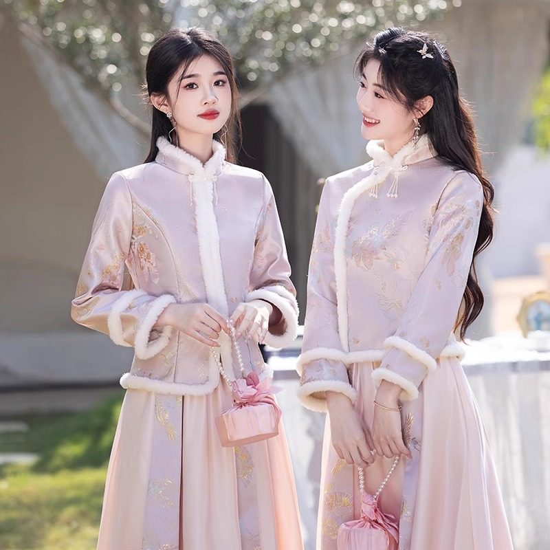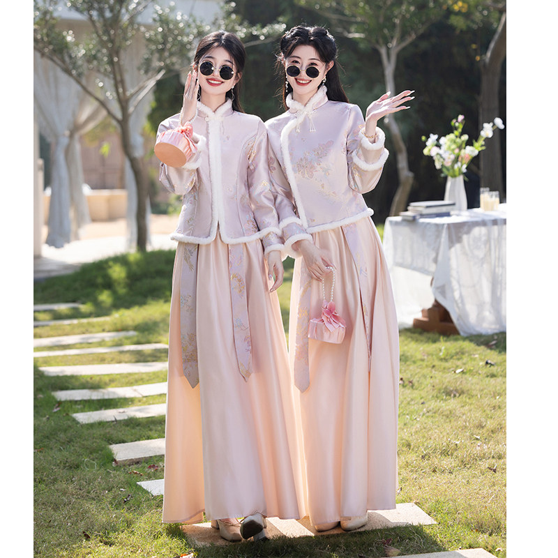 冬季 新中式 裙婚礼姐妹服保暖长袖 旗袍套装 加厚 伴娘礼服高级感新款