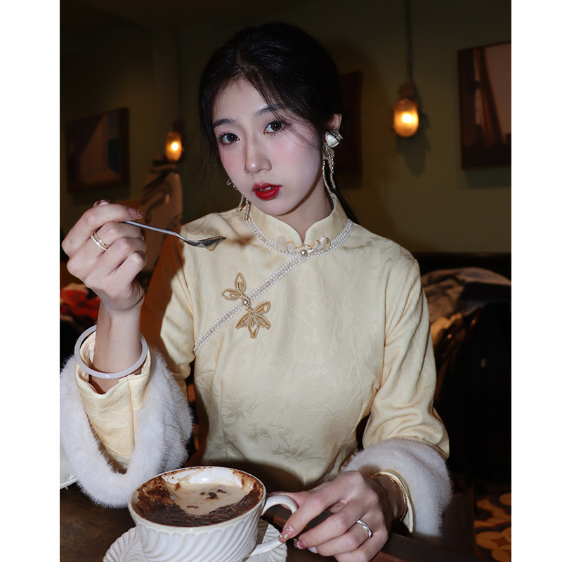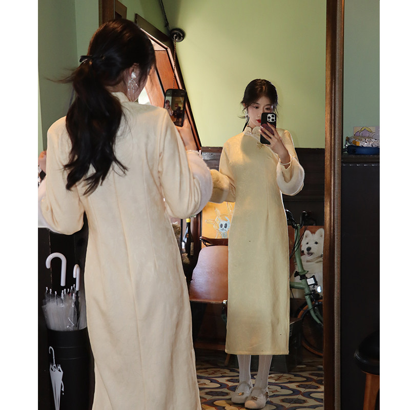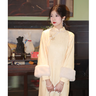 加绒女 秋冬改良高级感绝美冬季 云苓奶黄色新中式 国风旗袍2025新款
