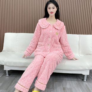亲嘴猫三层加厚保暖珊瑚绒情侣夹棉可外穿睡衣女冬连帽套装 家居服