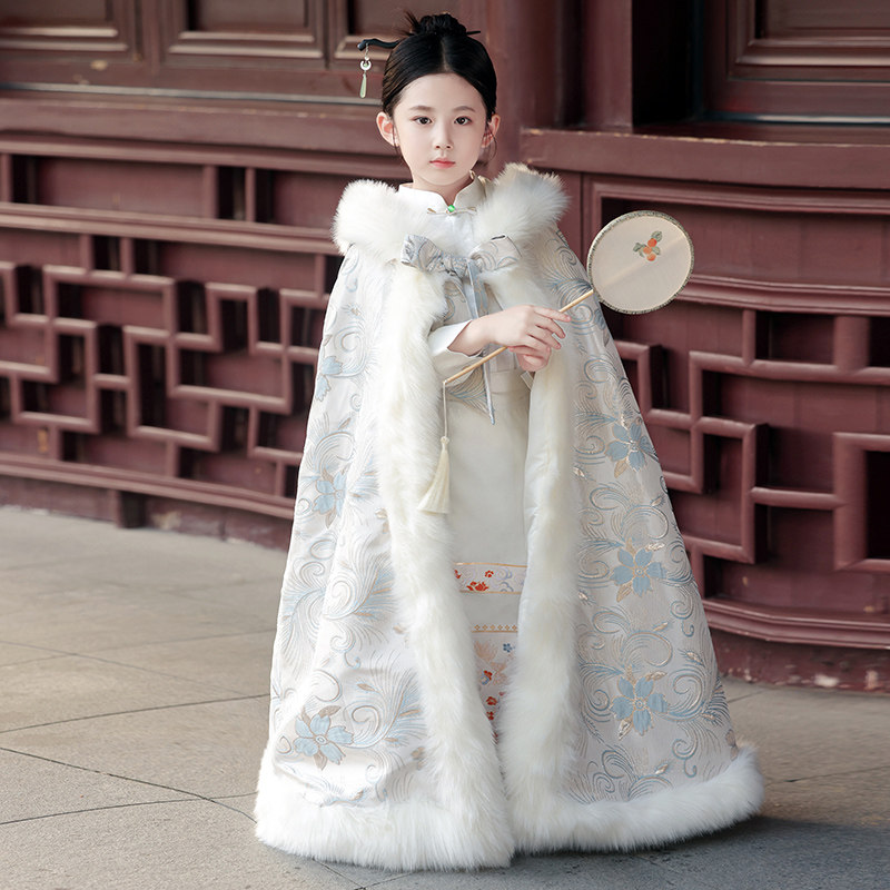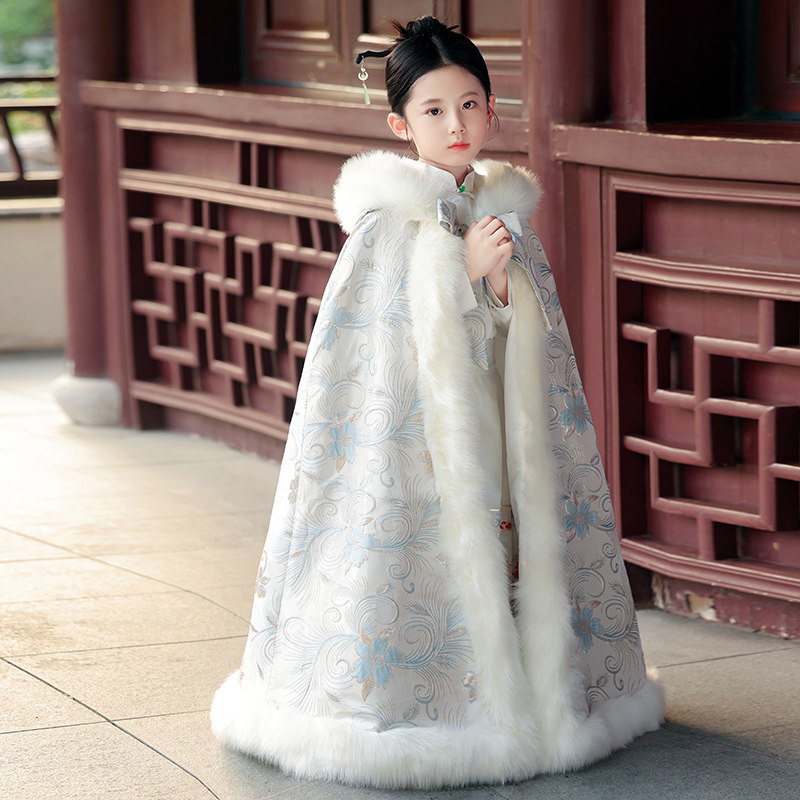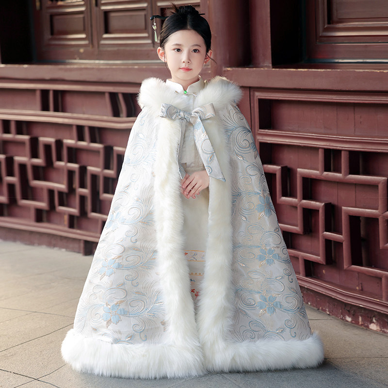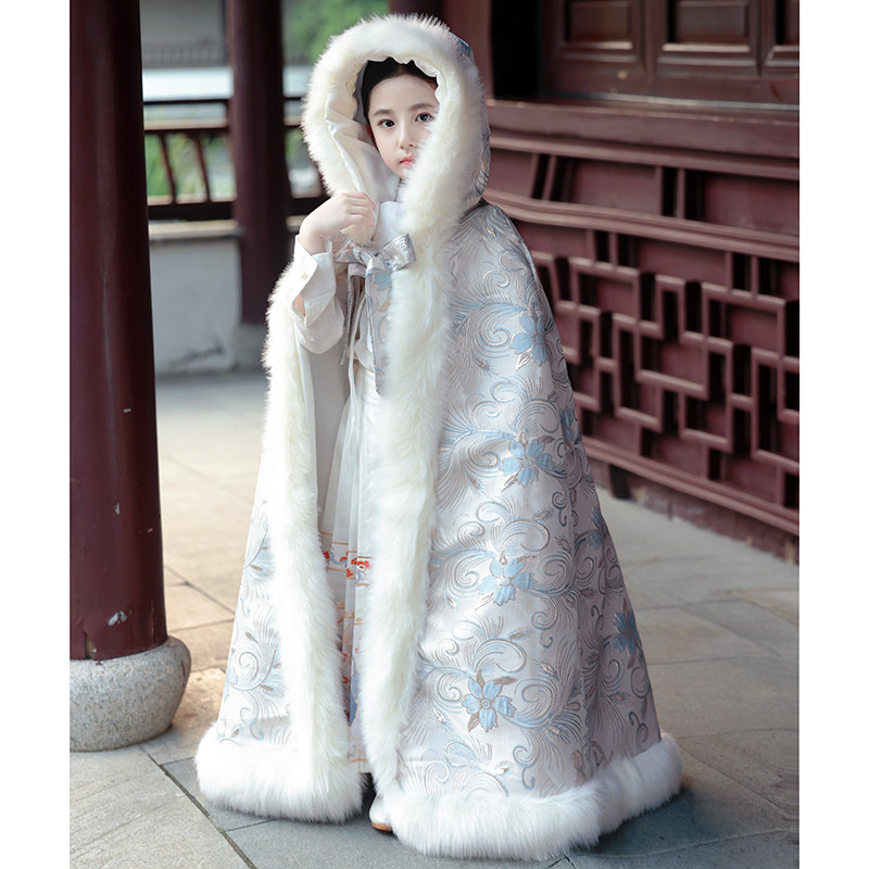 汉服加厚保暖小女孩大毛领斗篷 中国风古装 女童长款 披风连帽秋冬款