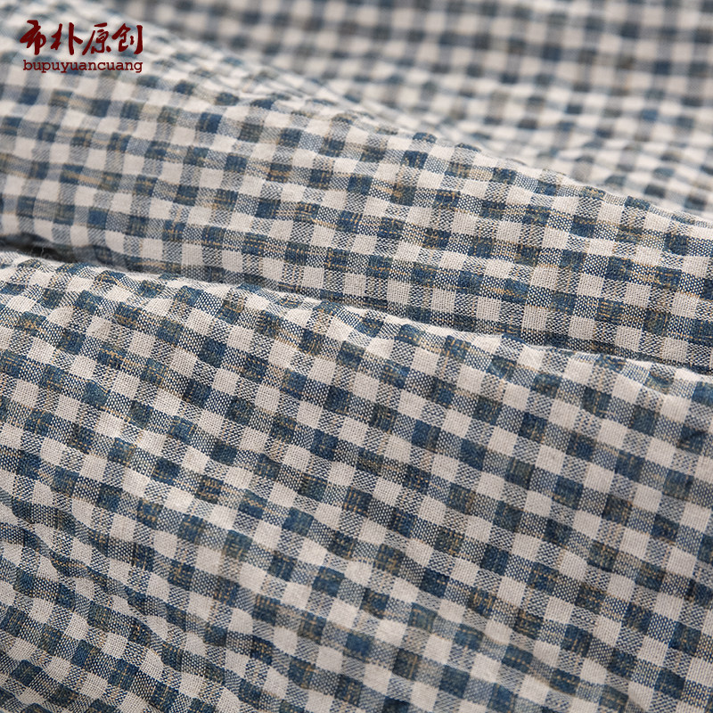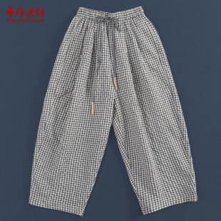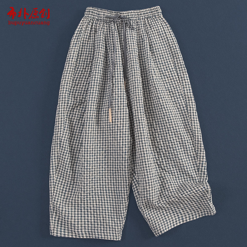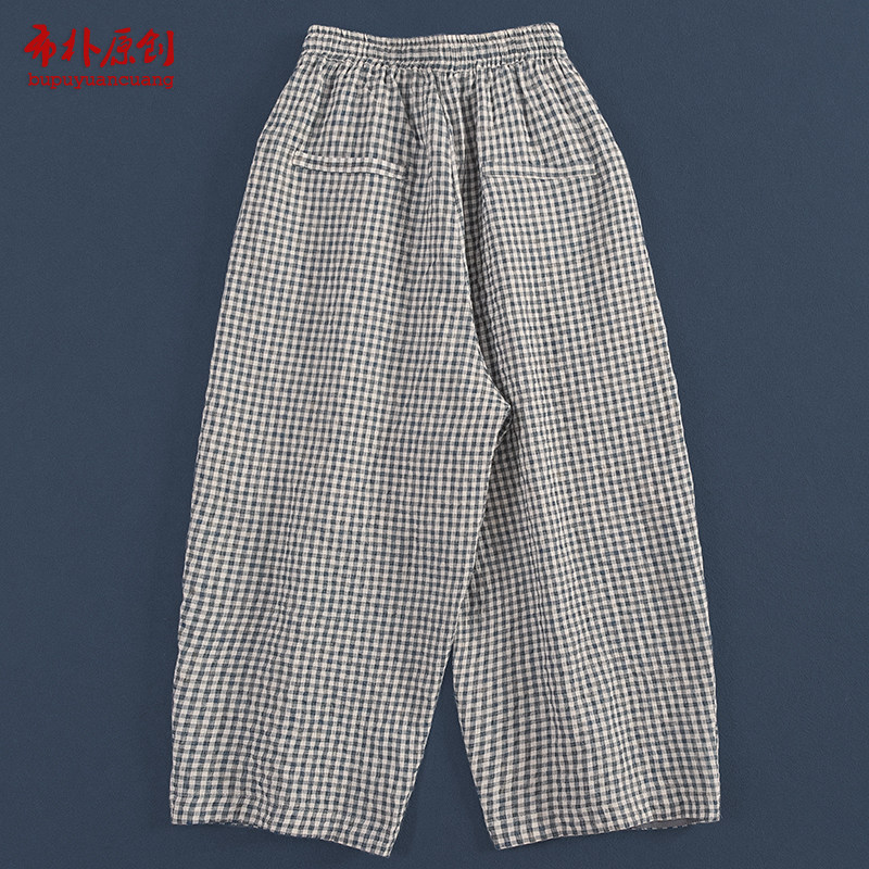 休闲女裤 亚麻色织泡泡纱微皱复古格纹萝卜裤 新品 布朴家作2026夏季