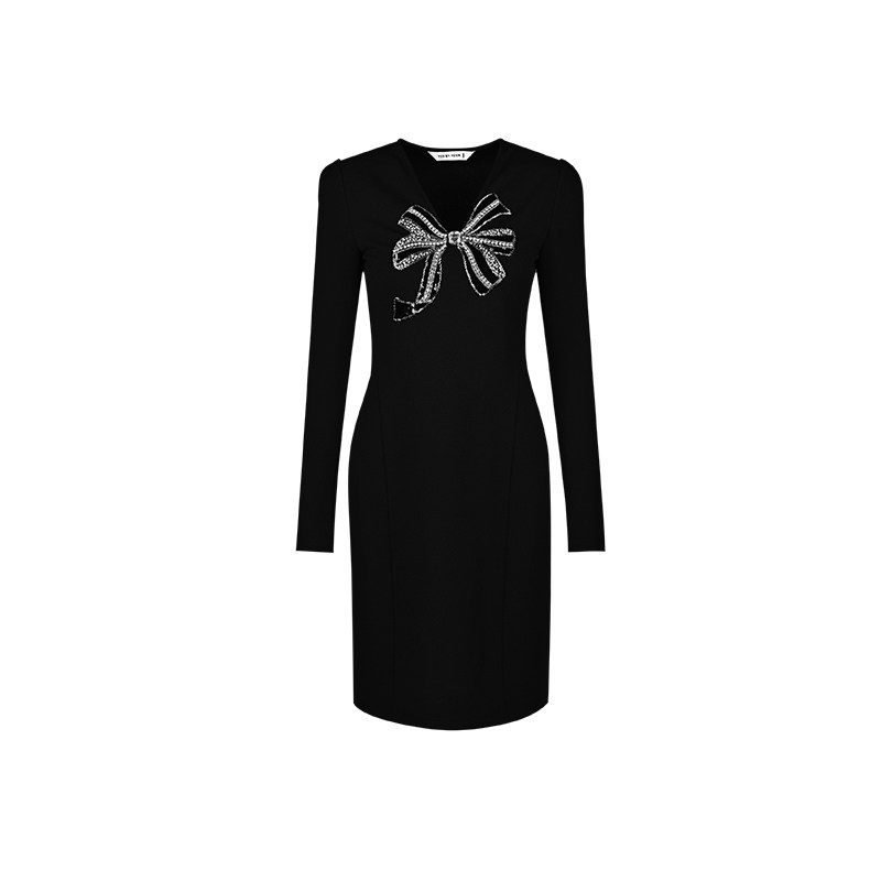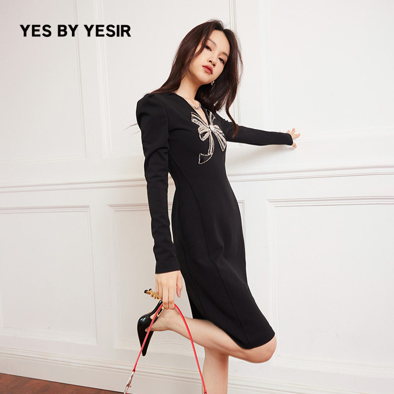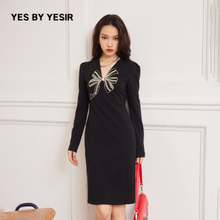 弹力黑色镶钻蝴蝶结修身 YESIR叶谦原创秋新款 连衣裙 YES
