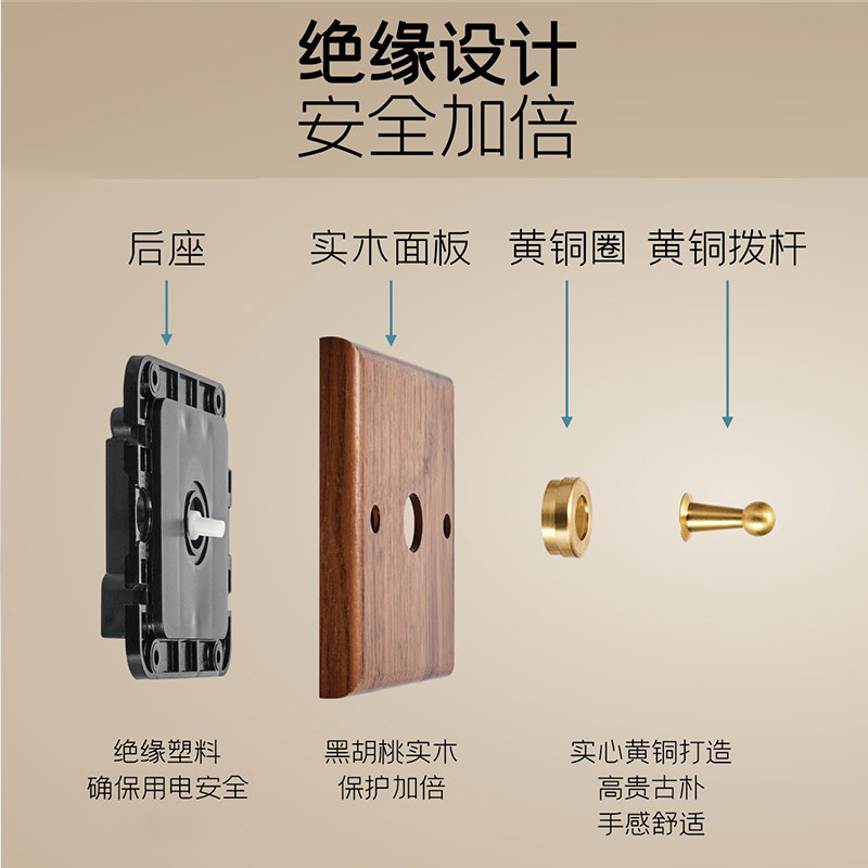 汉王美式 黑胡桃木实木复古开关插座面板黄铜拨杆木质86型仿古民宿