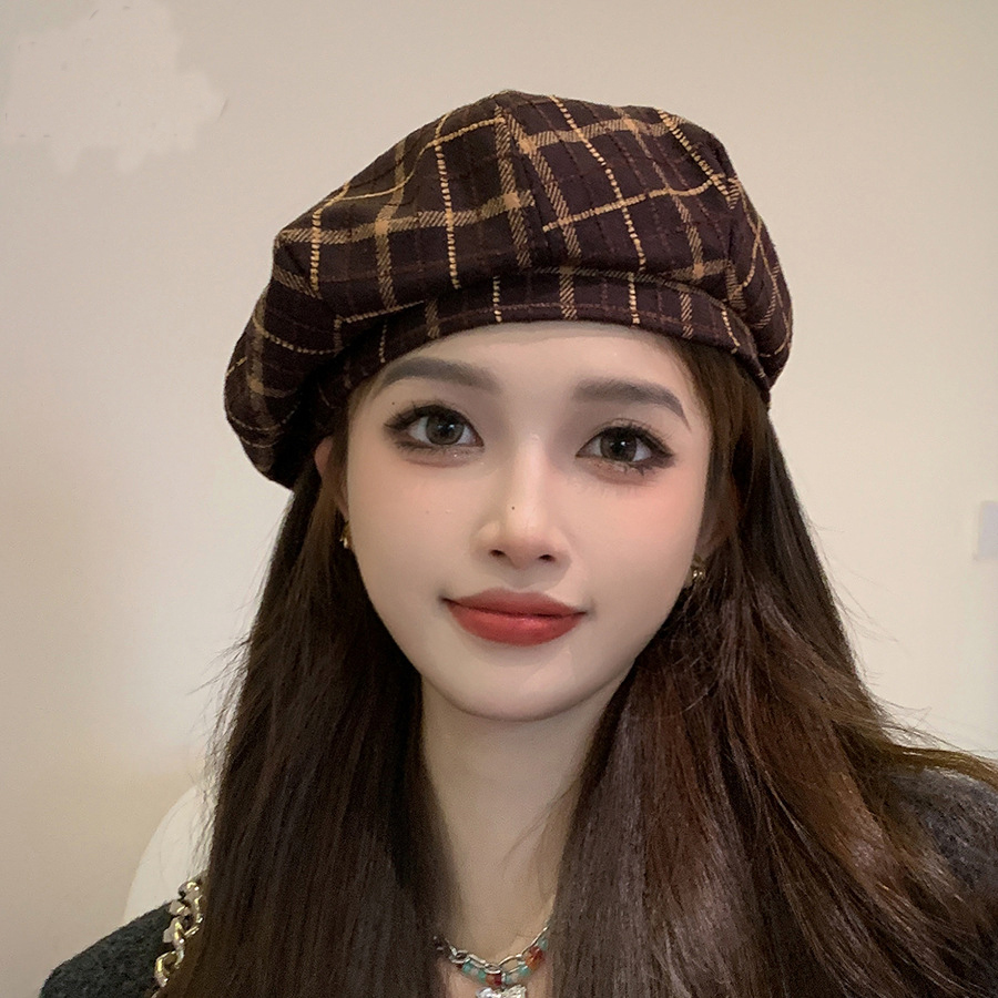 秋冬英伦复古格子贝雷帽子韩版 休闲画家帽简约毛呢帽产妇帽JC