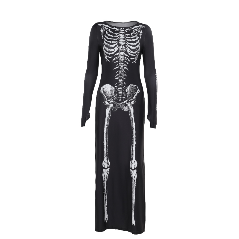 万圣节cosplay穿搭骷髅演出服印花连衣裙哥特黑色长裙搞怪长裙