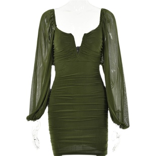 YoungGirlDay纯欲风性感U领紧身显瘦长袖 打底包臀鱼尾连衣裙长裙