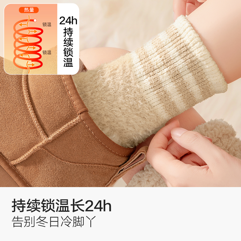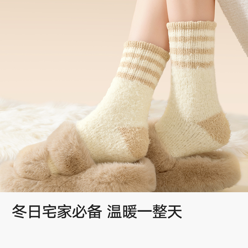 珊瑚绒袜子女秋冬季 地板袜加绒加厚居家睡眠袜保暖抗寒条纹中筒袜