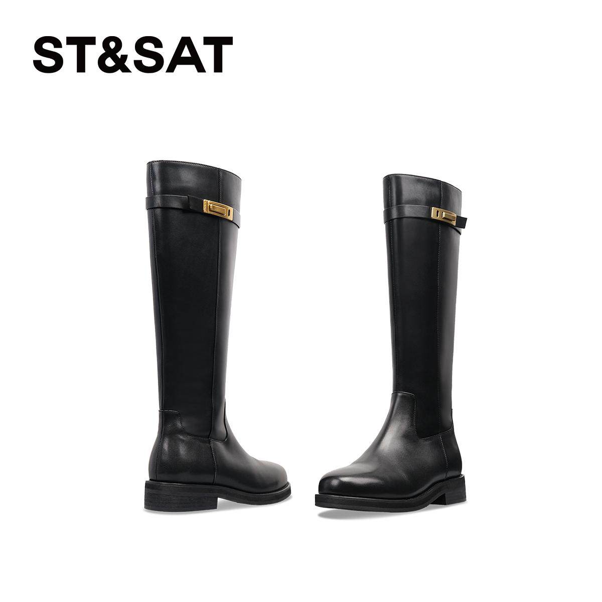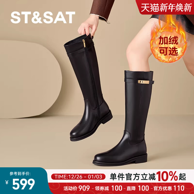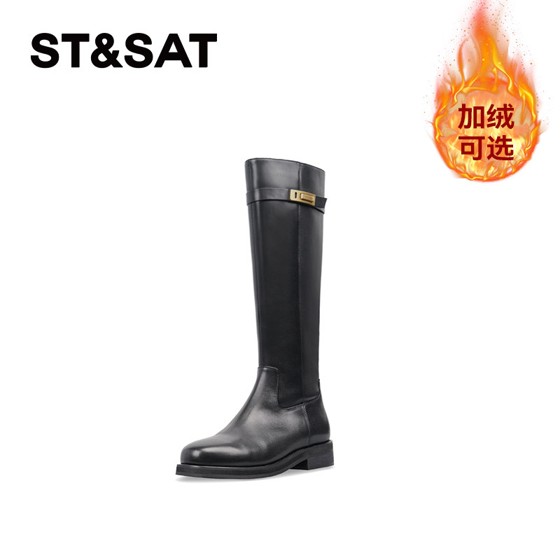 星期六骑士靴女靴不过膝秋冬英伦长筒靴增高长靴 真皮牛皮加绒