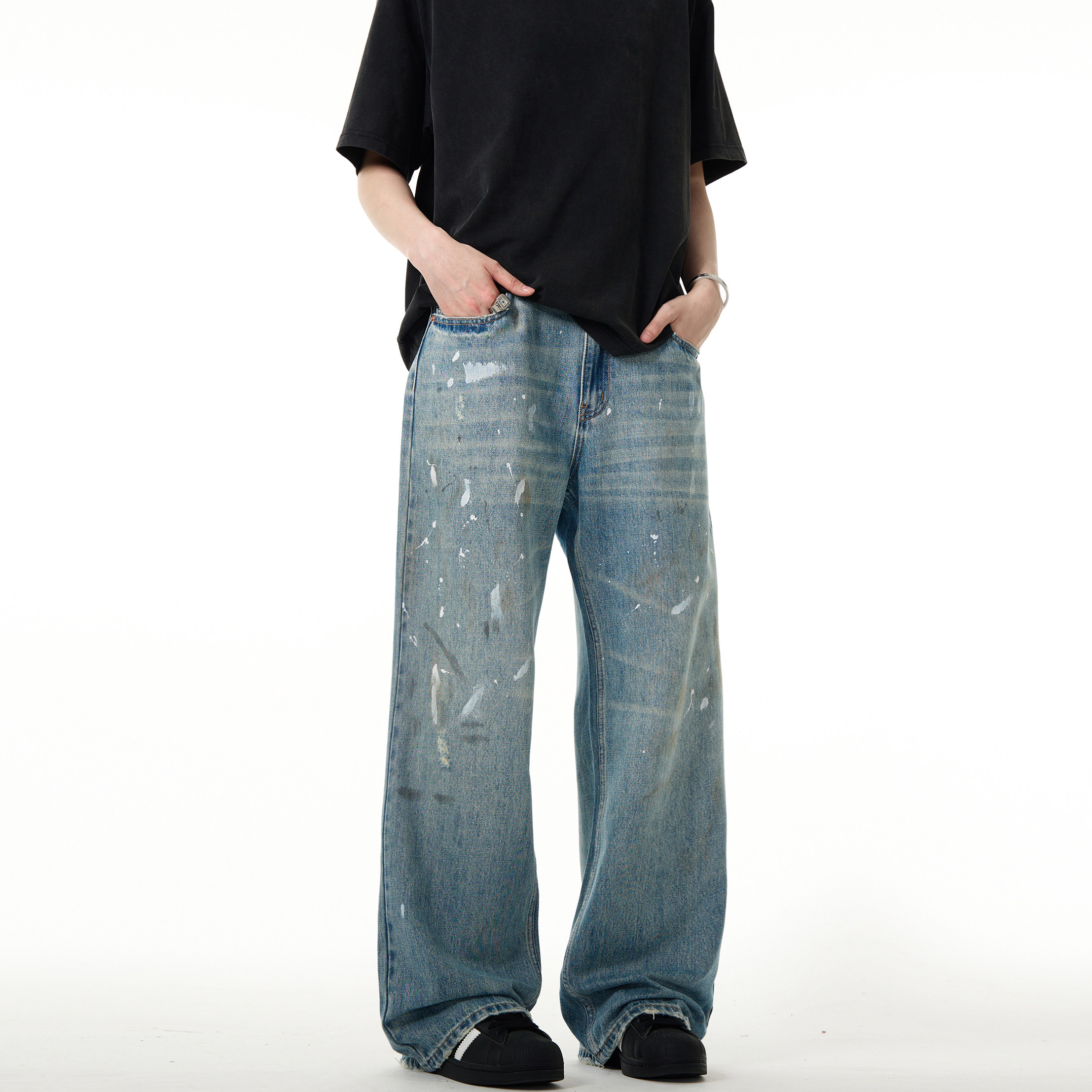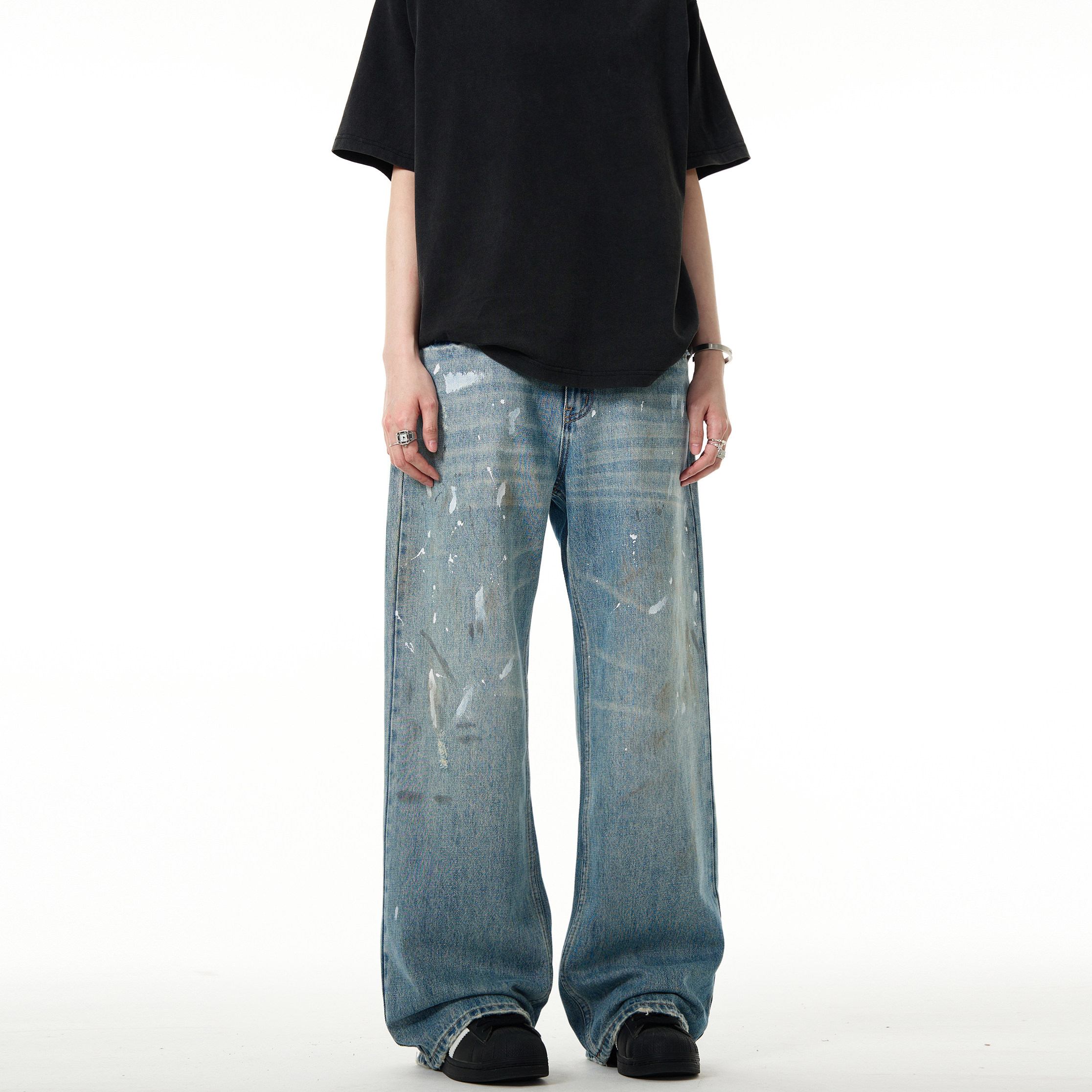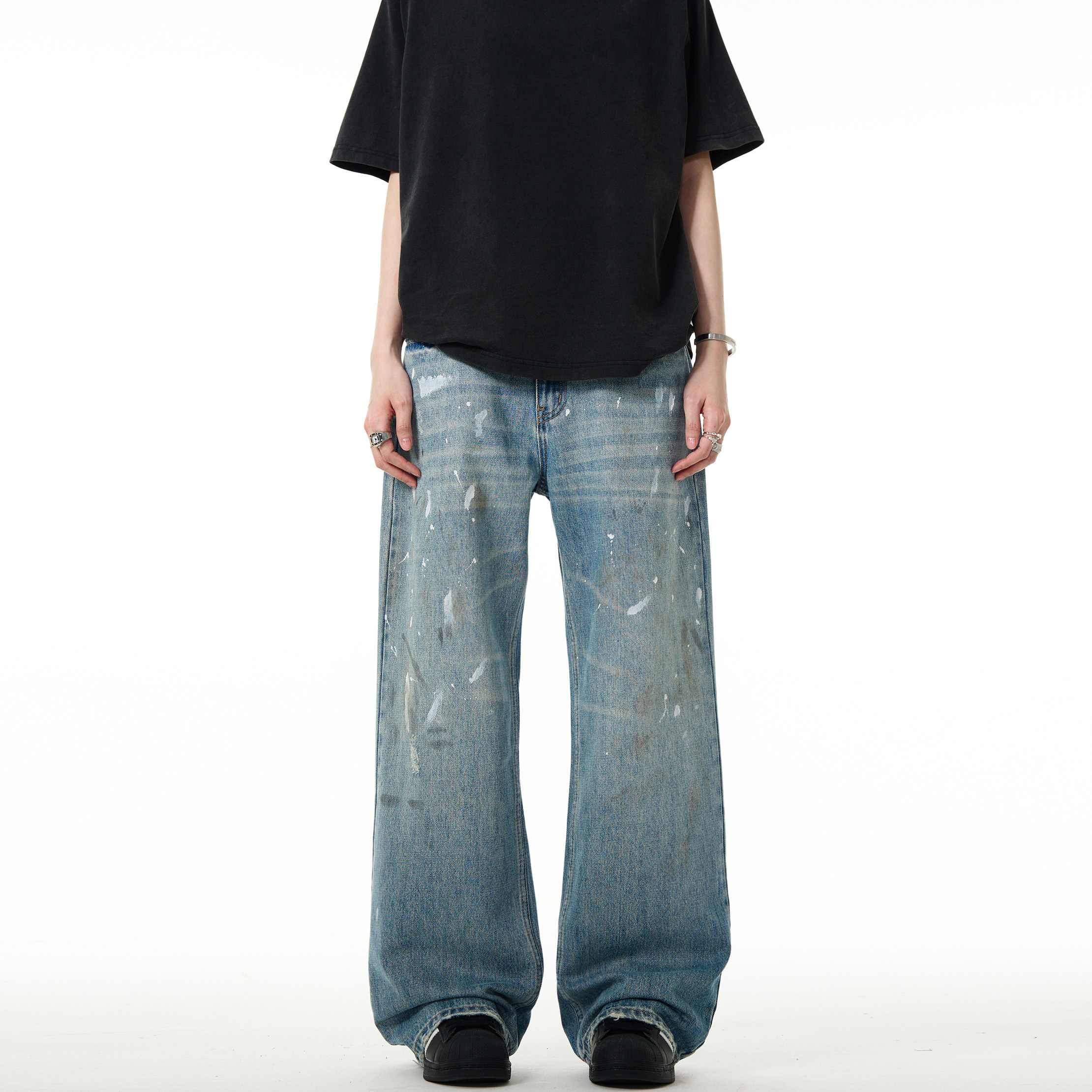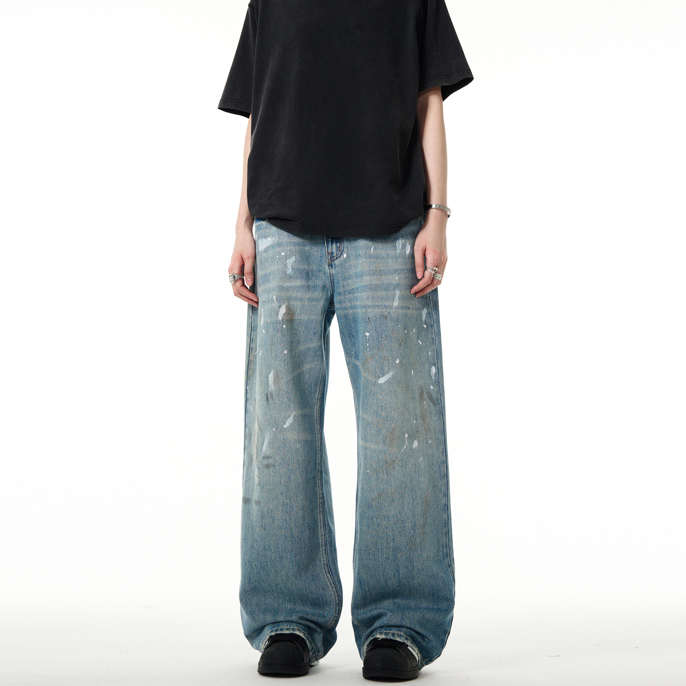 子 男女宽松休闲小众设计感直筒裤 MADWITCH美式 高街潮牌泼墨牛仔裤