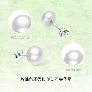 周六福S925银珍珠耳钉女白色馒头珠优雅素淡水珍珠耳饰新年礼物