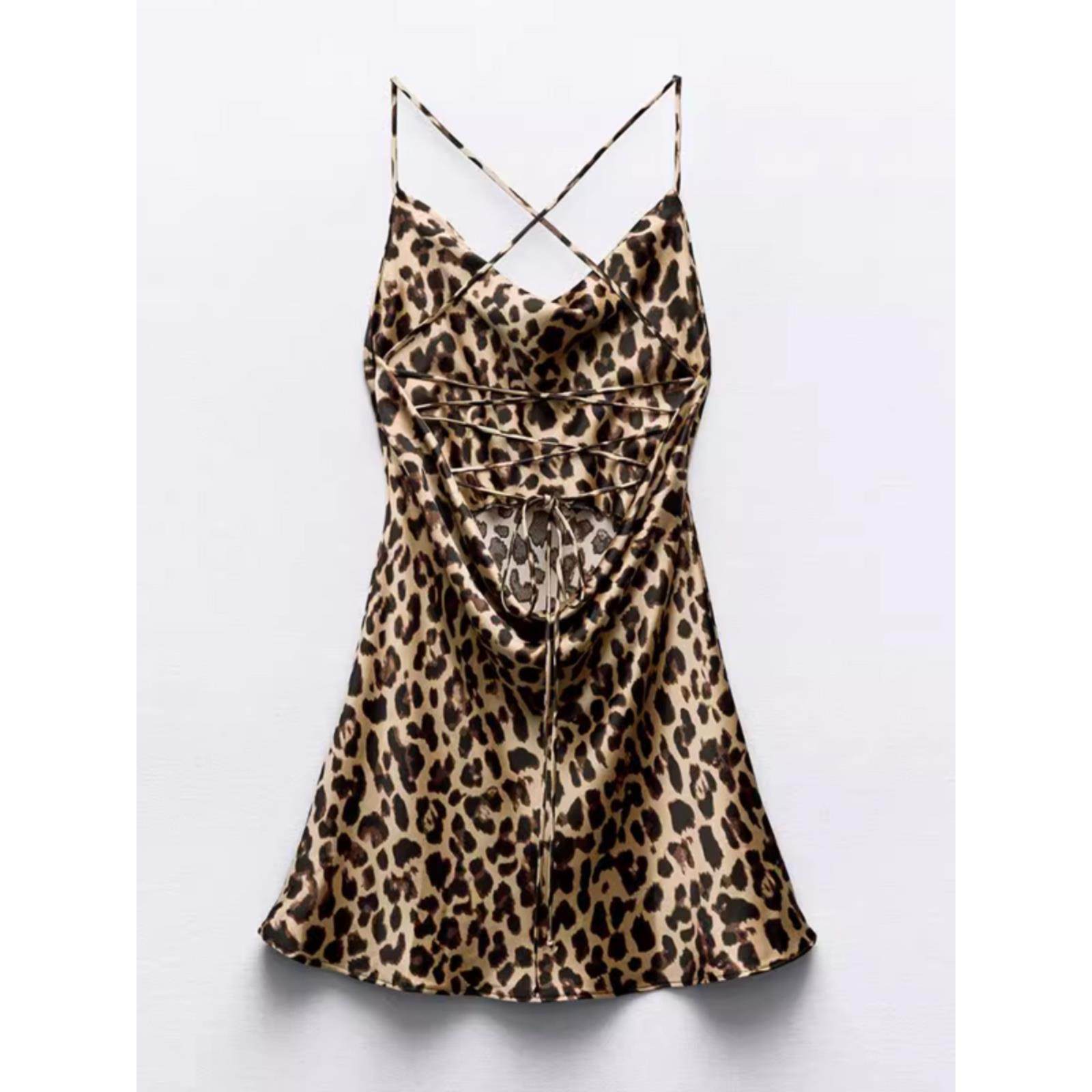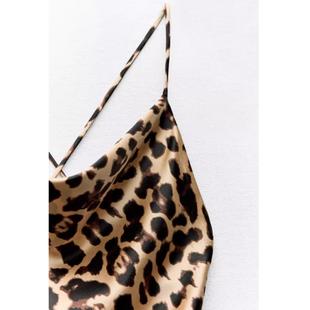 ZA外贸出口豹纹印花丝缎质感荡领露背短款 吊带连衣裙女3550026
