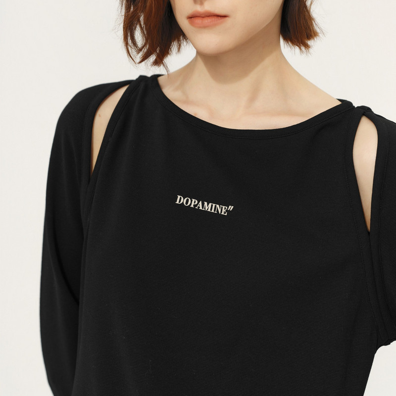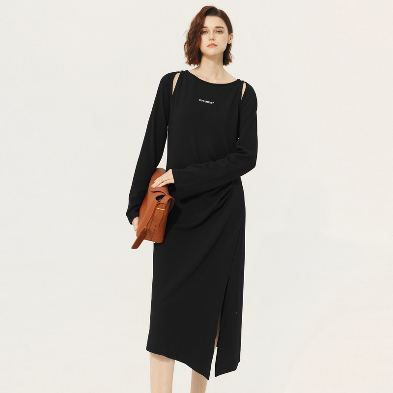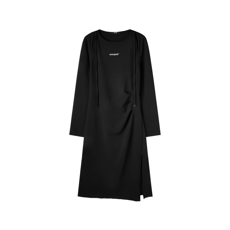 新款 TI黑色抽褶镂空连衣裙女百搭简约开衩休闲长裙尤缇2025春季
