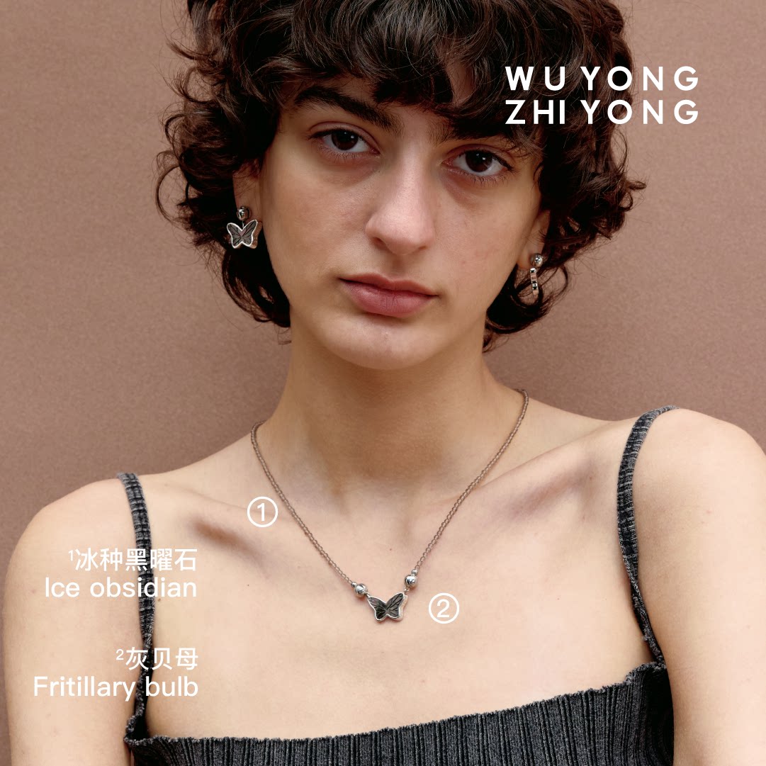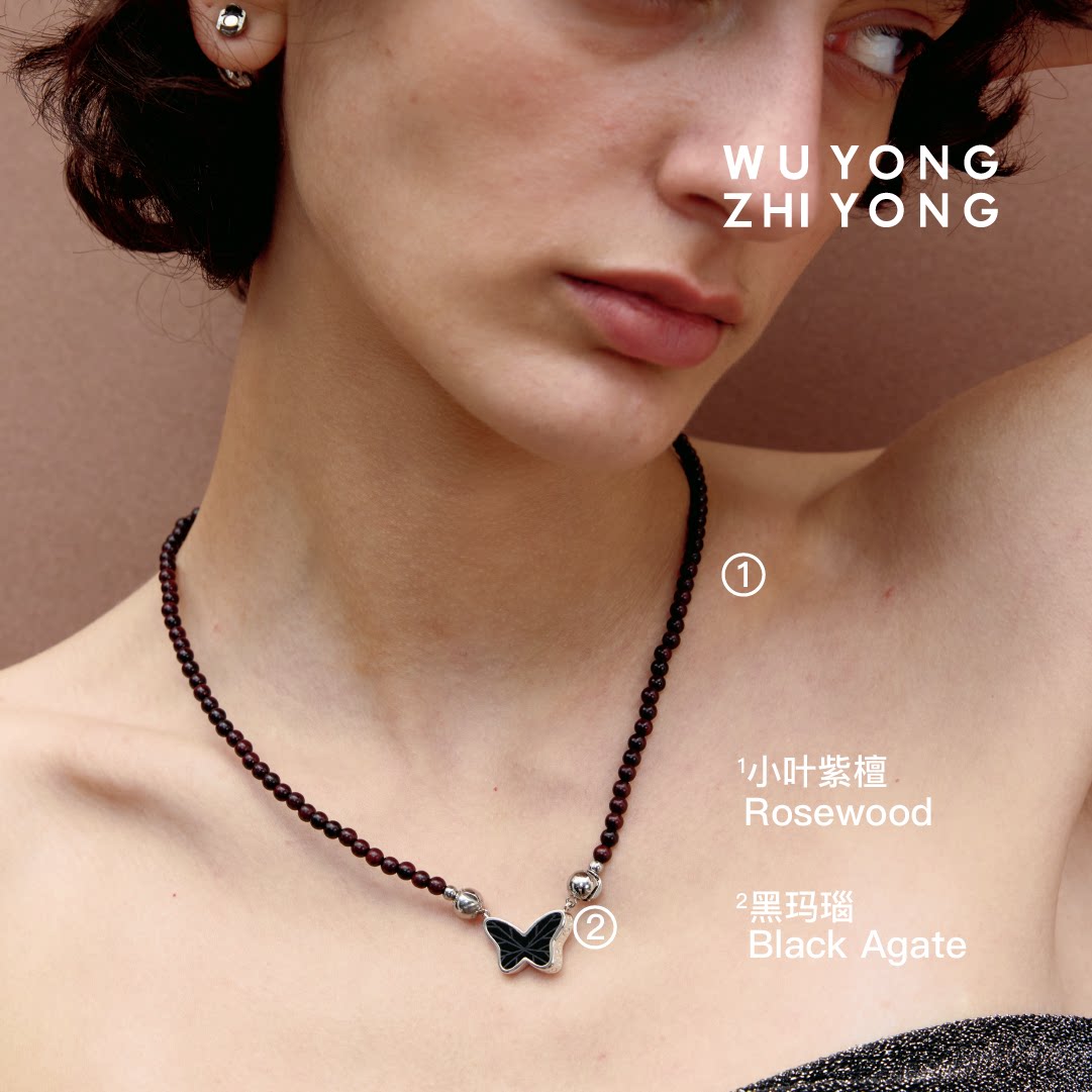 无用之用「蝴蝶系列」天然粉晶黑曜石小叶紫檀猛犸贝母蝴蝶项链女