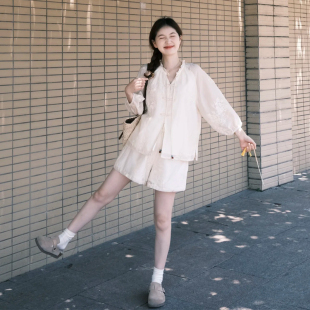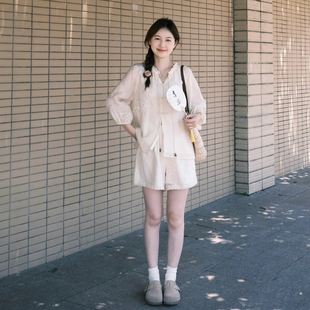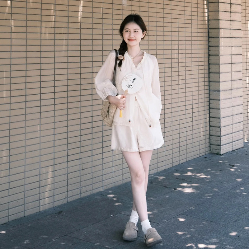 新款 女夏季 盘扣灯笼袖 衬衫 两件套 新中式 高腰阔腿短款 国风禅意套装