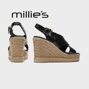 夏厚底草编一字交叉带露趾坡跟凉鞋 MILLIE 女新款 妙丽高跟凉鞋