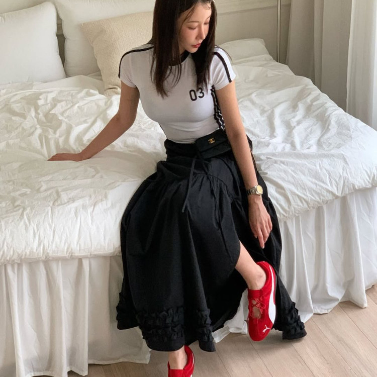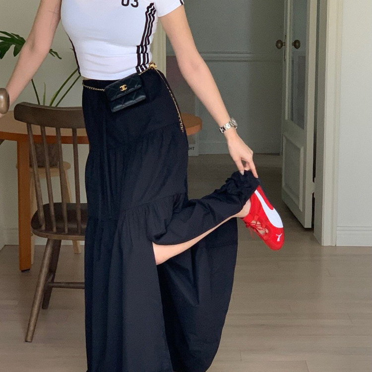 韩国小众设计感拉满新款 高腰拼接木耳边显瘦长裙 白色半身裙女式