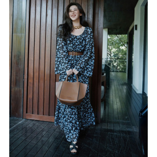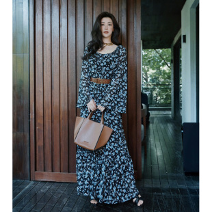 雪纺连衣裙女秋季 复古长袖 度假风显瘦气质碎花长裙子 法式 朱珠同款
