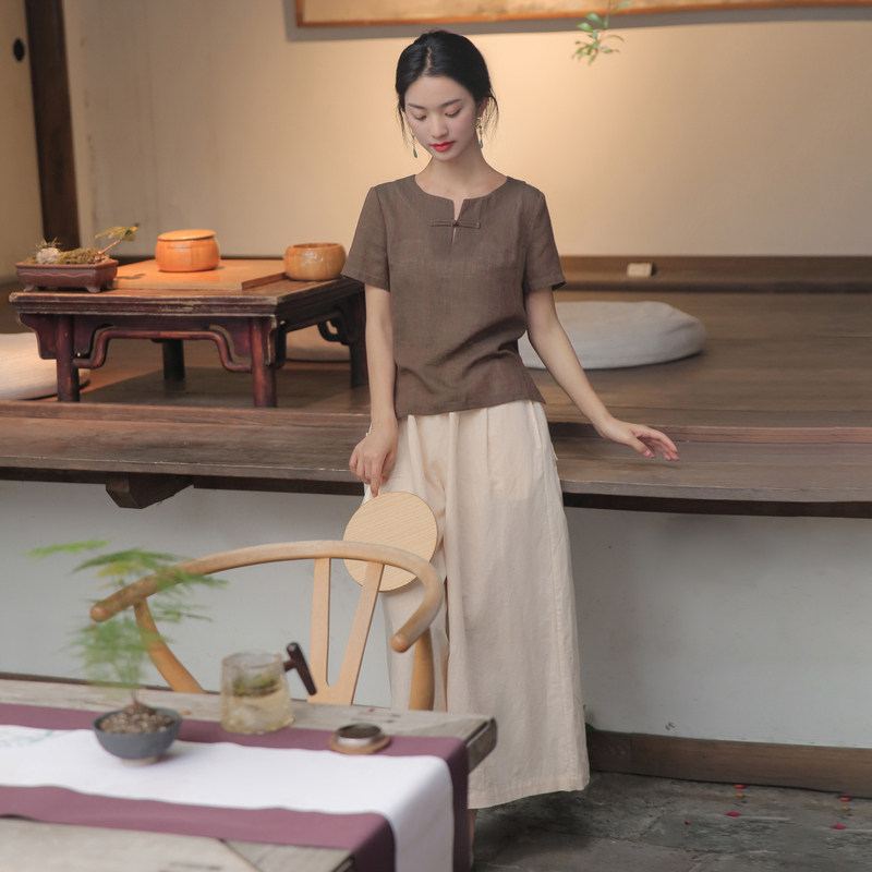 小个子素衣居士服盘扣短袖 夏季 茶服 女上衣高级禅服女套装 亚麻唐装