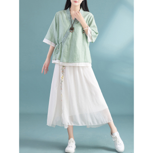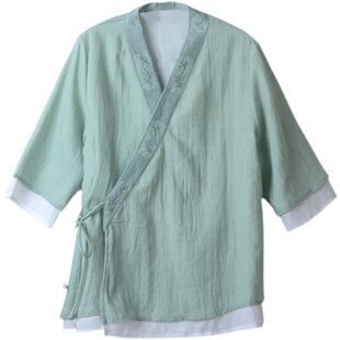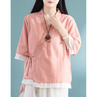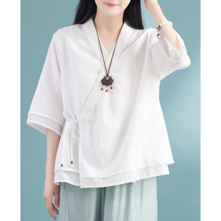中国风棉麻复古汉服上衣 女2024新款 夏季 宽松V领刺绣斜襟系带开衫