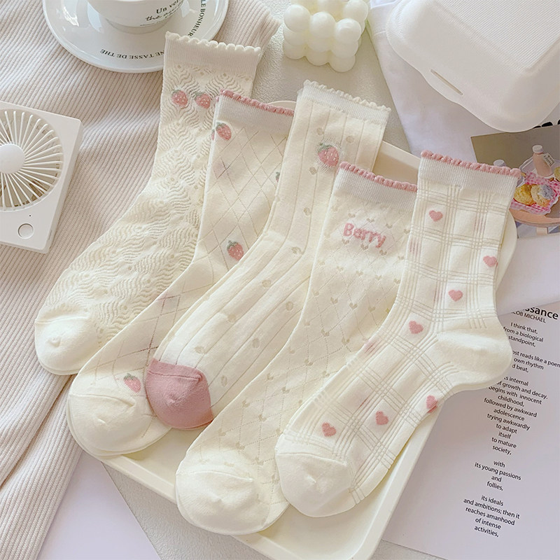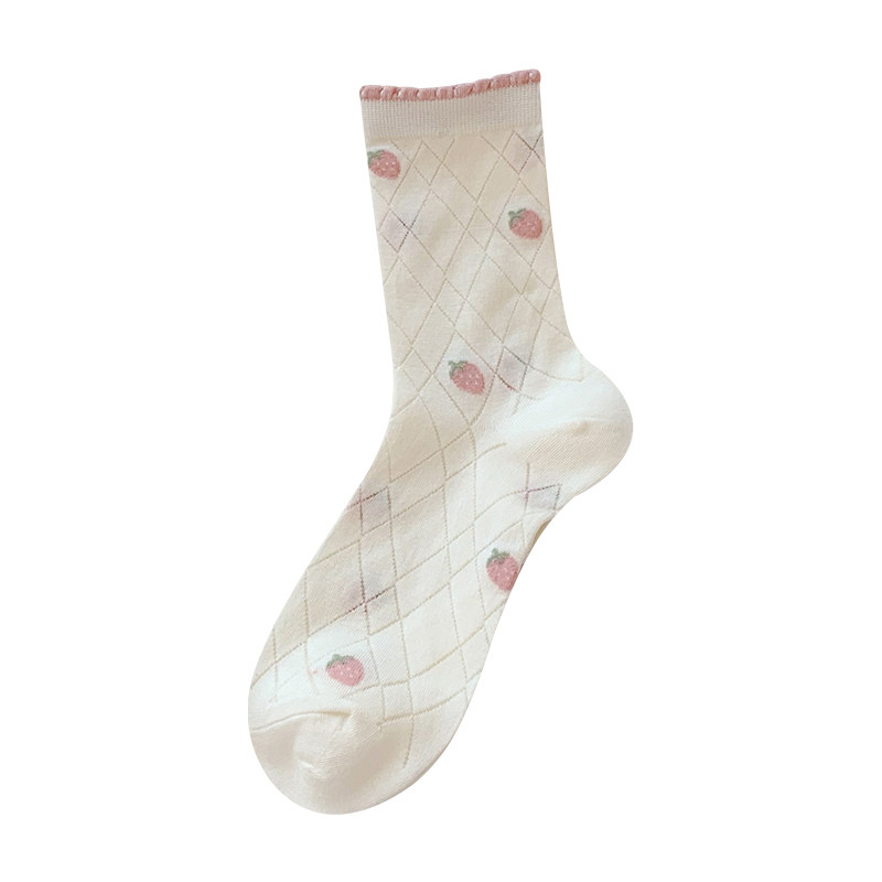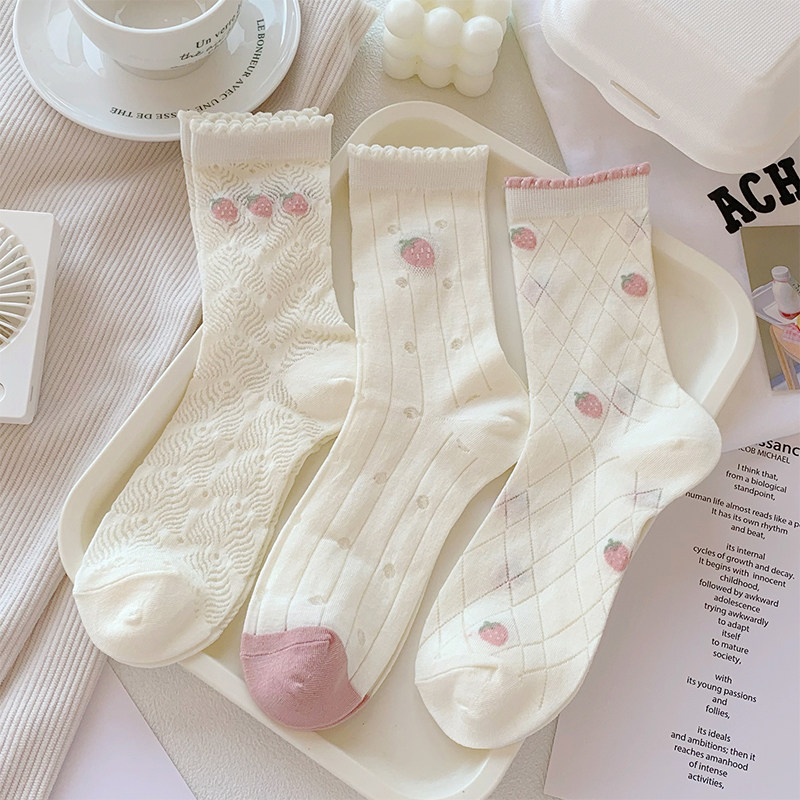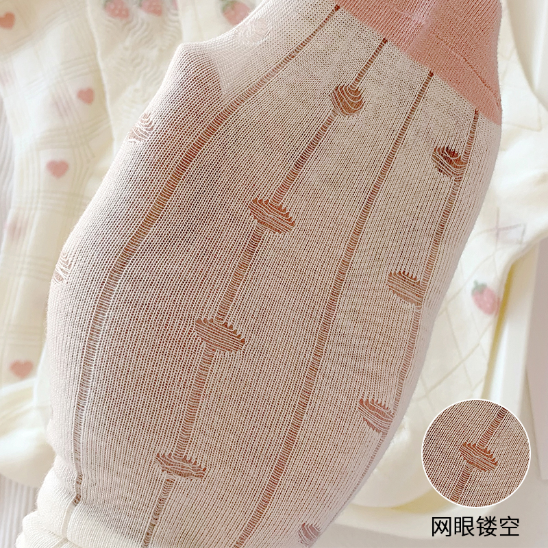 粉色草莓袜子女夏季 透气ins潮中筒袜可爱日系棉底冰丝堆堆袜 薄款