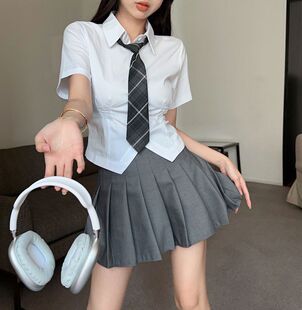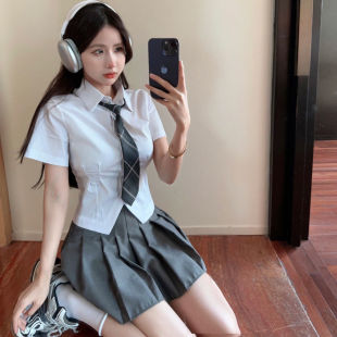 纯欲风褶皱设计感修身 衬衫 衬衣半身百褶短裙子 jk制服甜辣短袖 套装