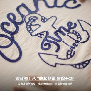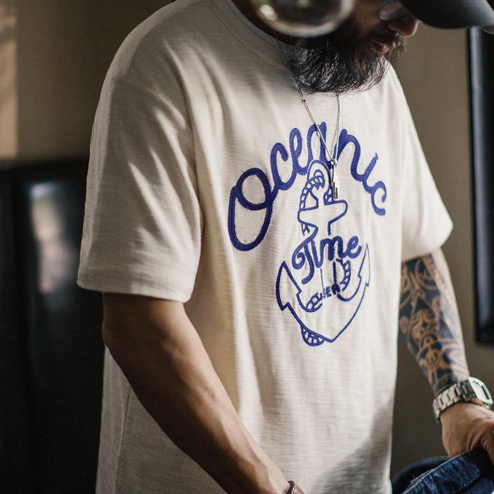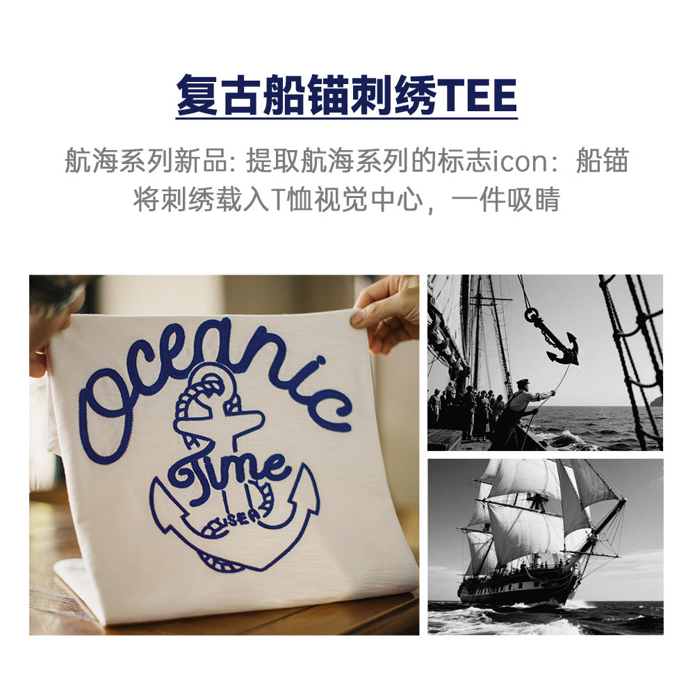 男夏季 复古海军刺绣T恤白色重磅竹节棉螺纹领口短袖 美式 马登工装