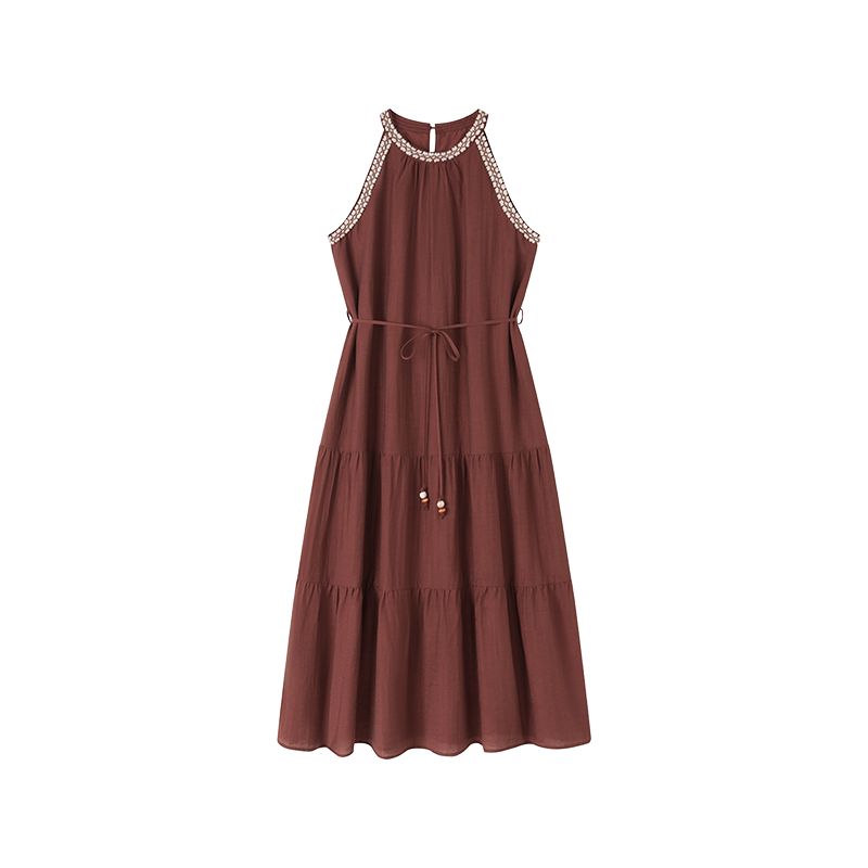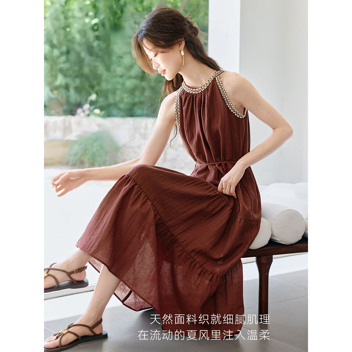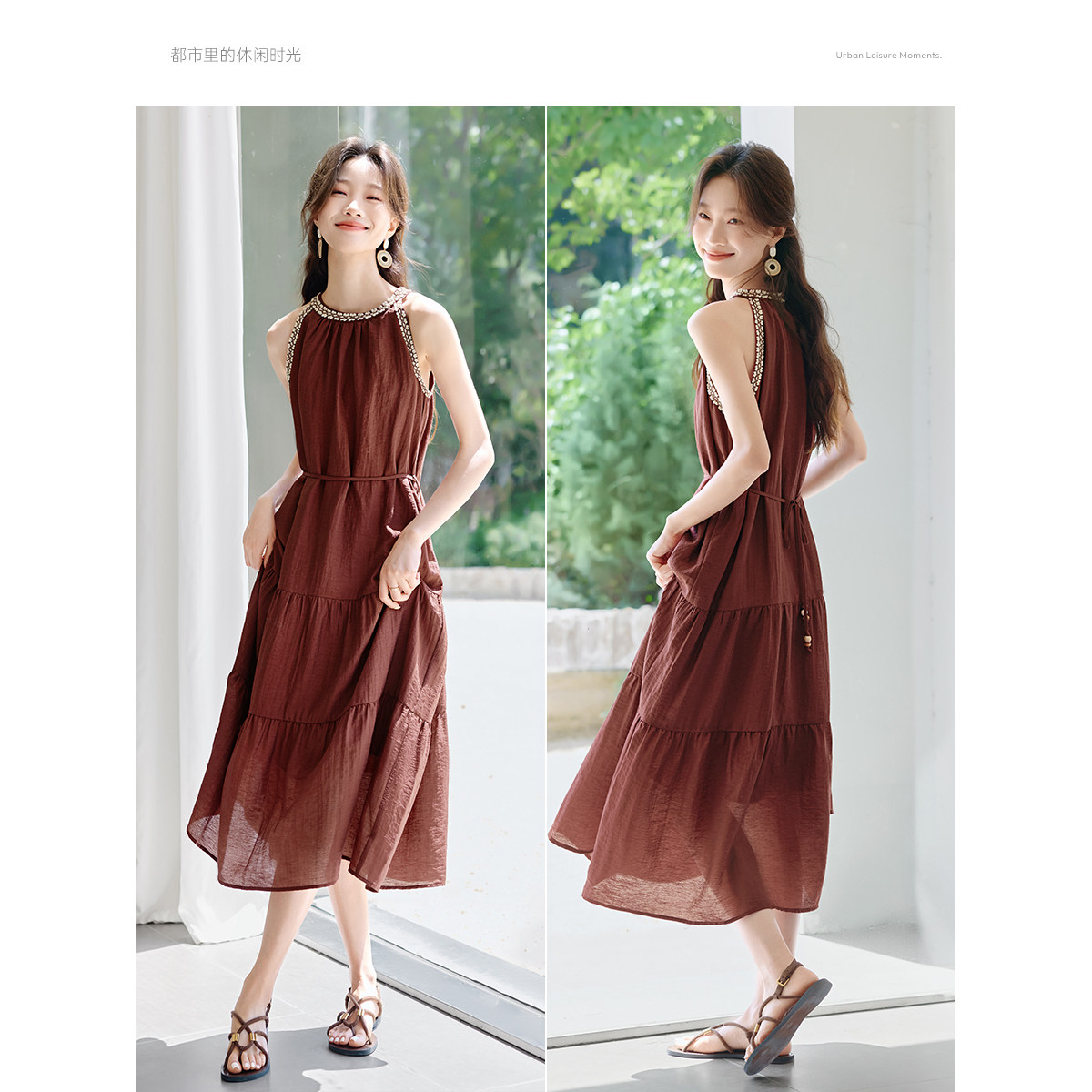 沫晗依美气质显白红裙2026夏季 复古波西米亚织带挂脖连衣裙女 新款