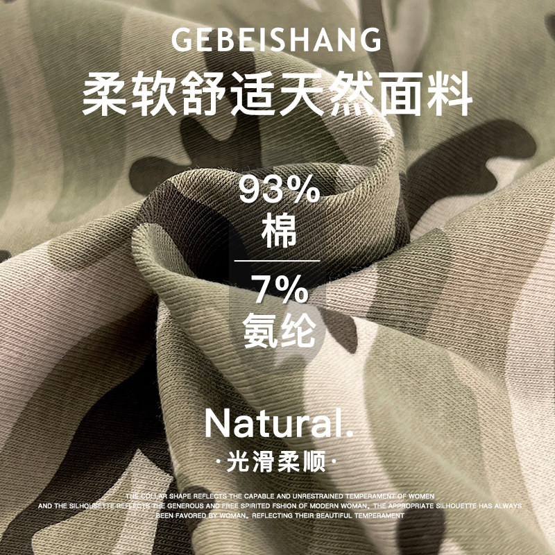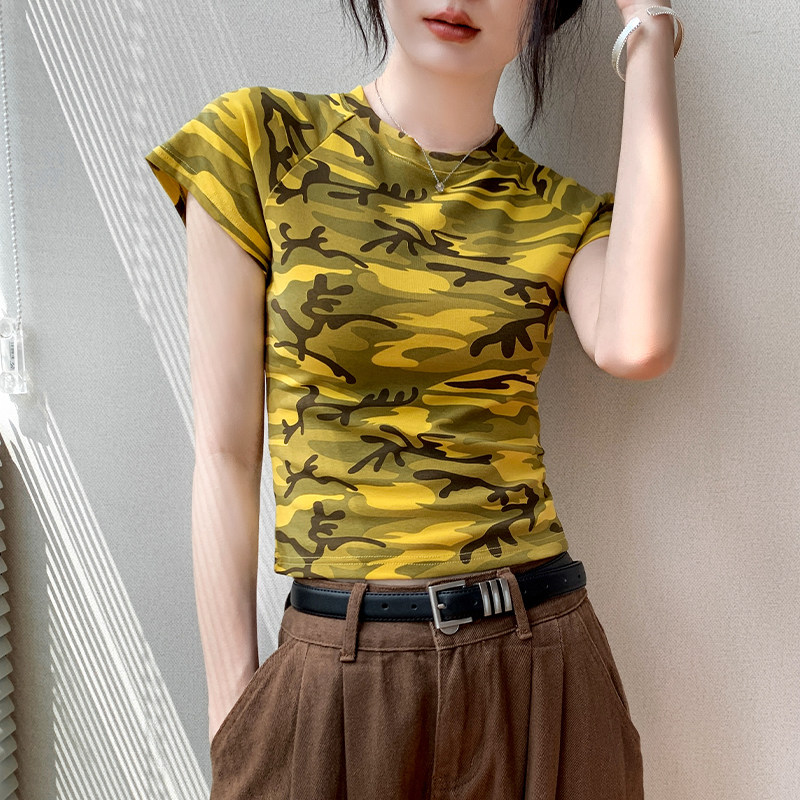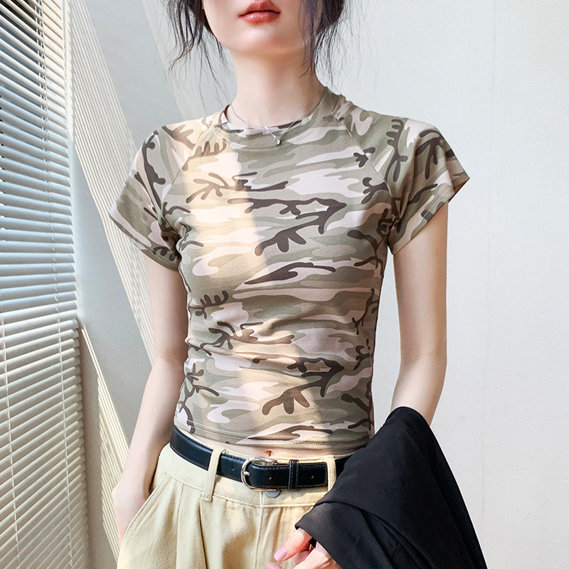 夏季 女t恤2025新款 特别漂亮掐腰独特上衣女 圆领迷彩插肩短袖 美式