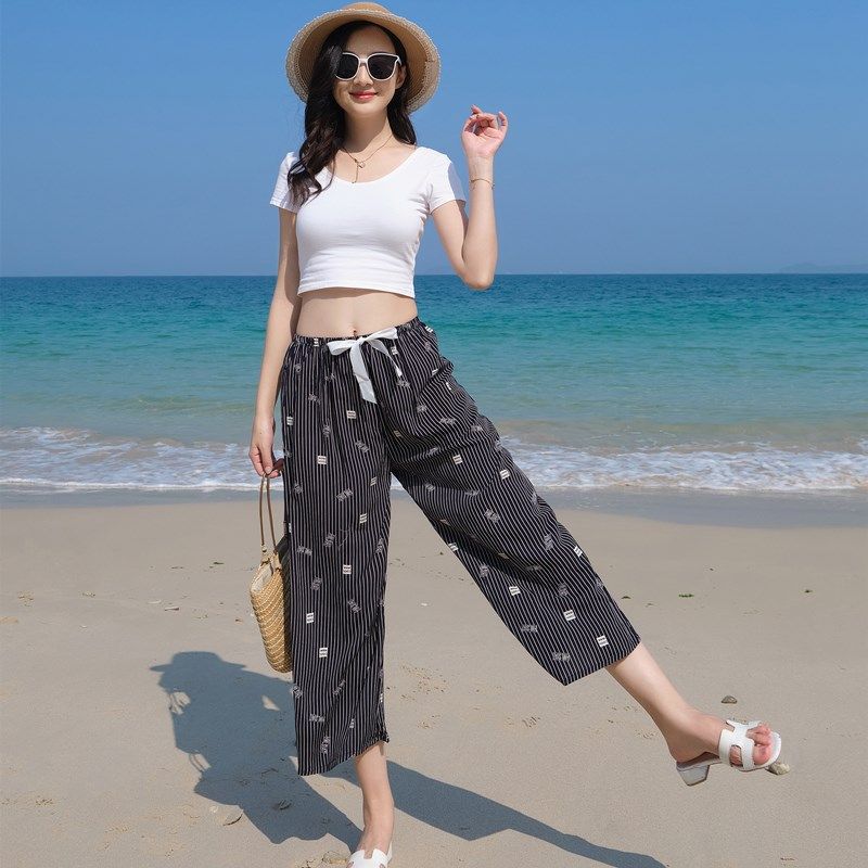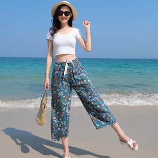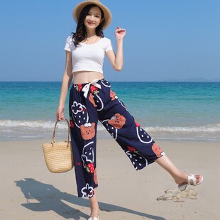 八分薄休闲沙滩裤 夏凉人造棉裤 宽松裙裤 绵绸大脚大码 女棉绸阔腿裤