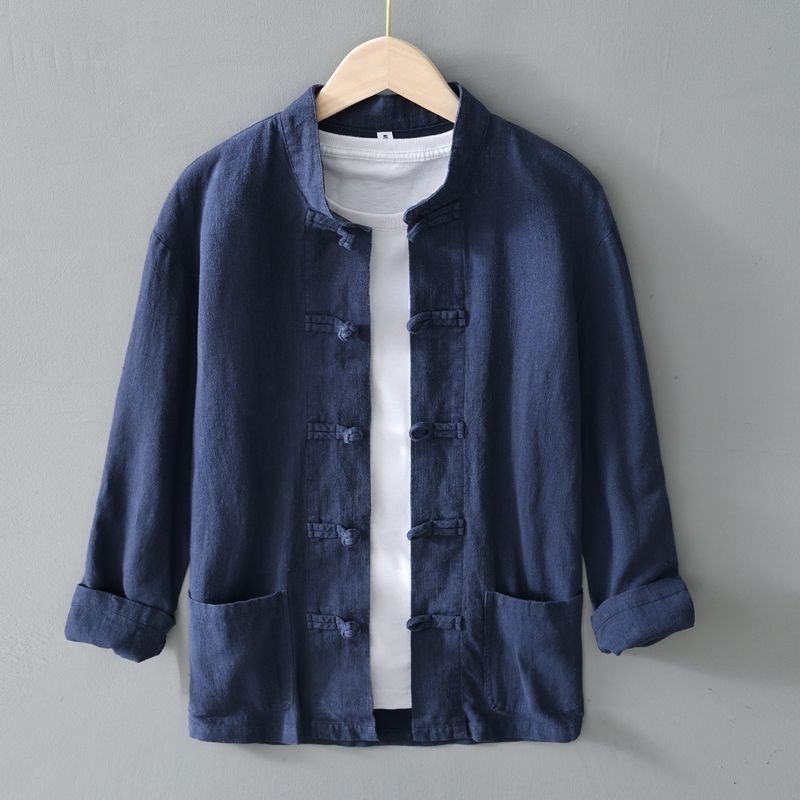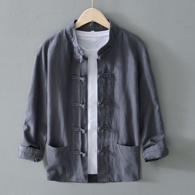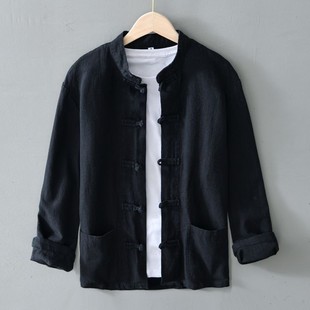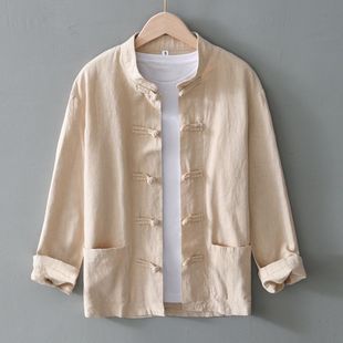 衬衣棉麻布衣服春夏季 中式 唐装 男长袖 亚麻外套薄 复古盘扣苎麻衬衫