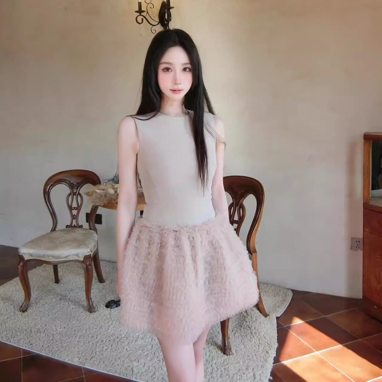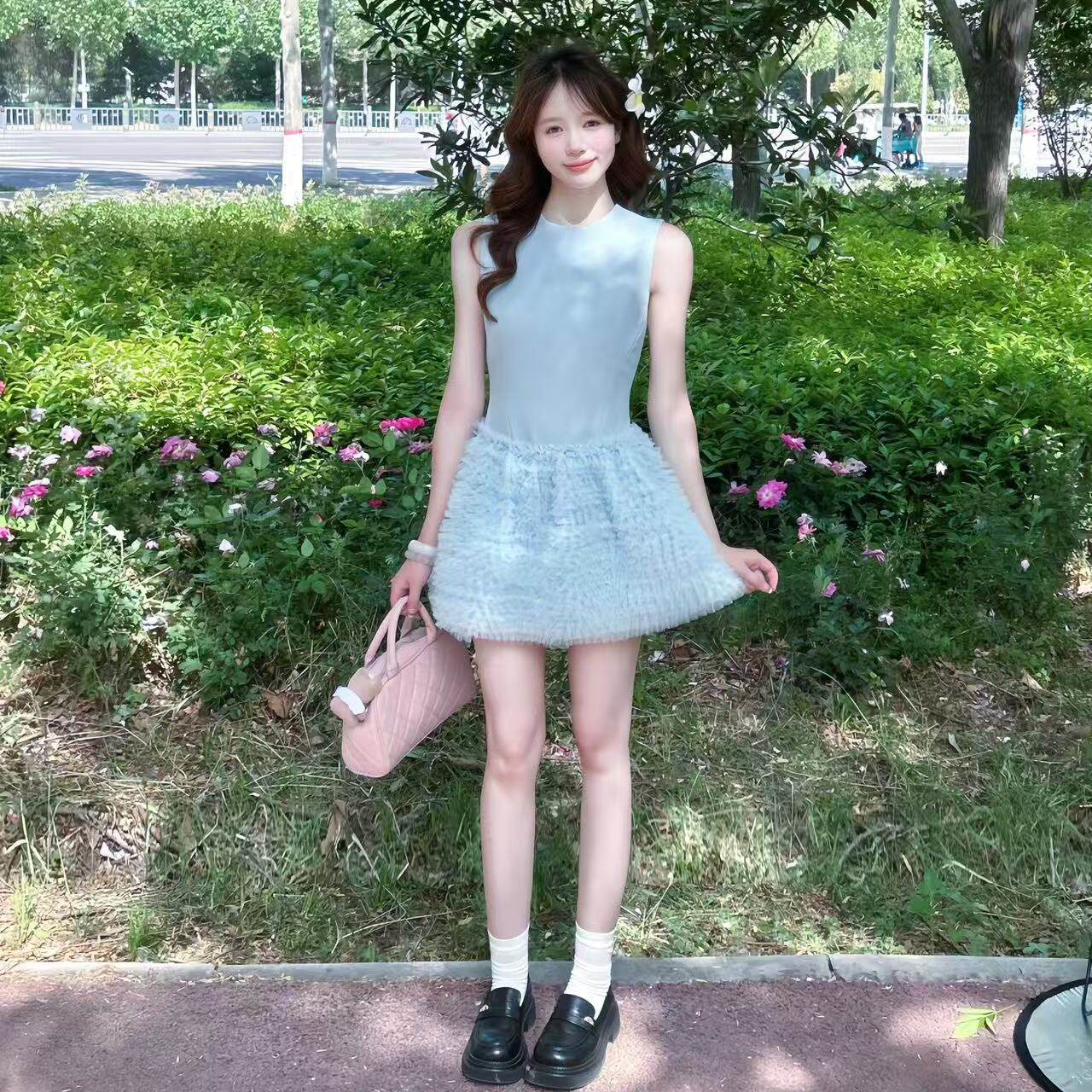 自制2026设计感无袖 气质圆领网纱蓬蓬裙a字裙短裙女夏 拼接蛋糕裙