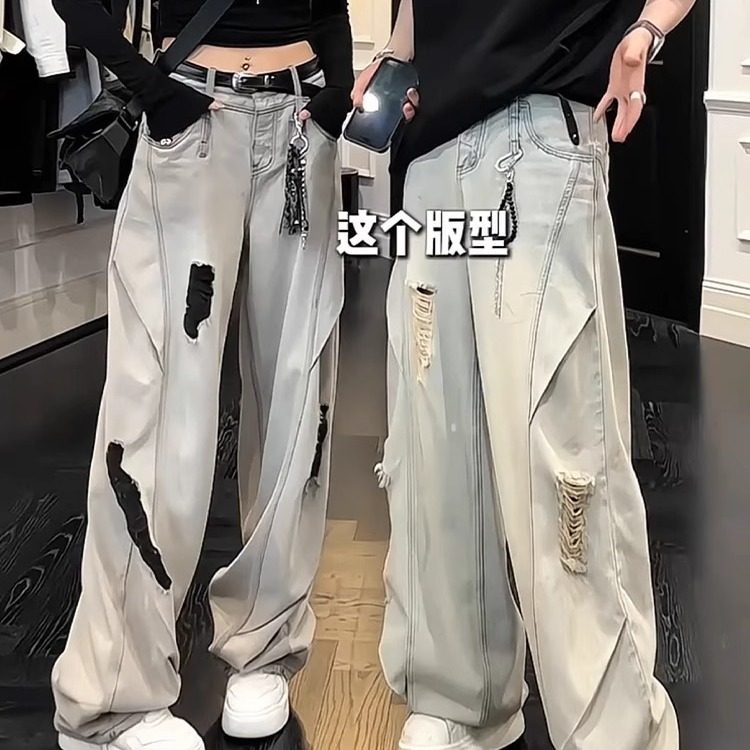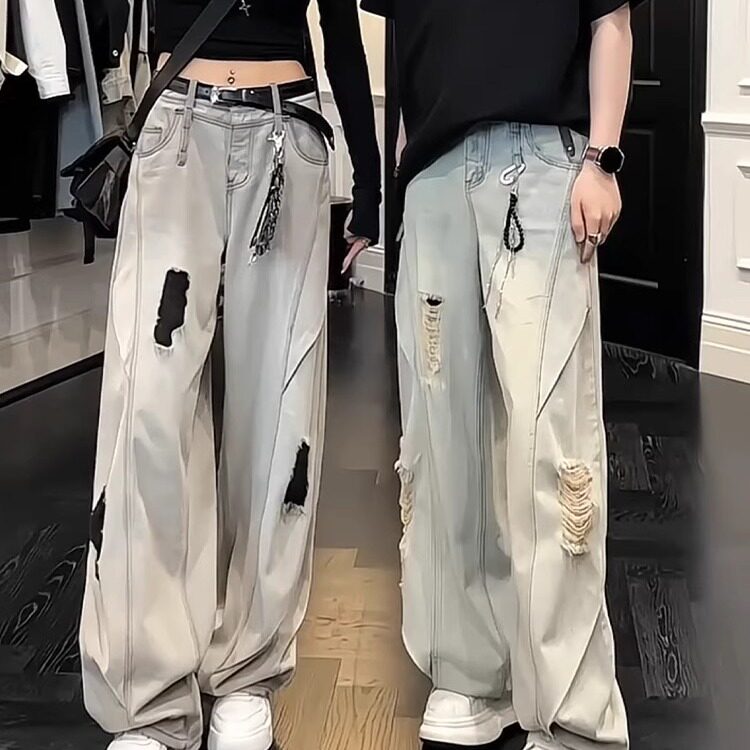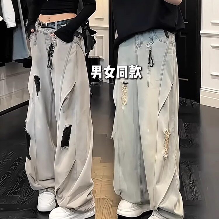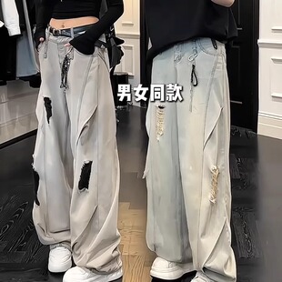 夏日情侣ootd穿搭蓝色破洞牛仔裤 子 直筒男女模弯刀微喇休闲阔腿裤