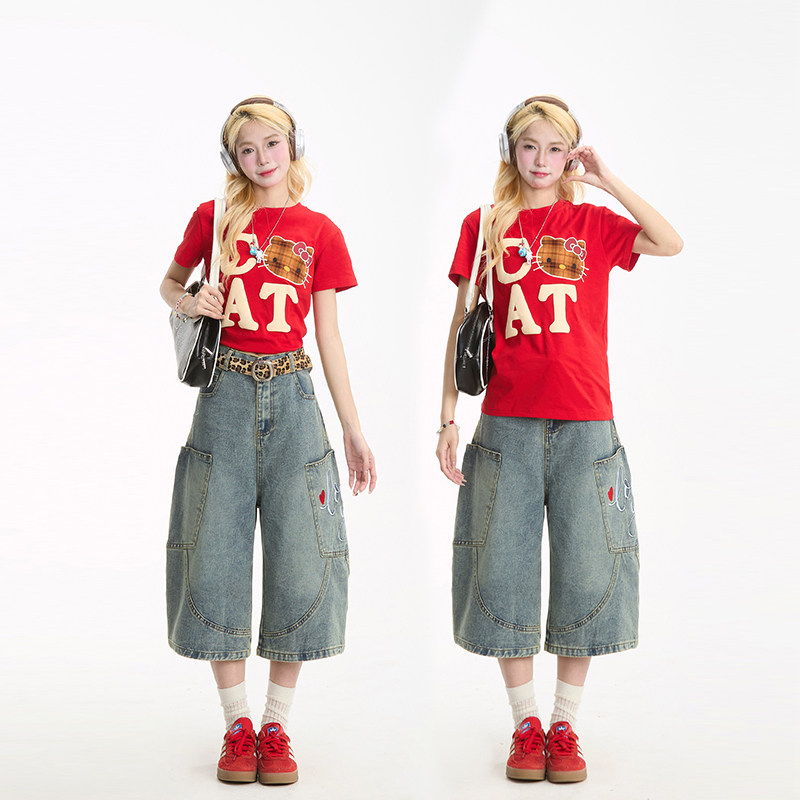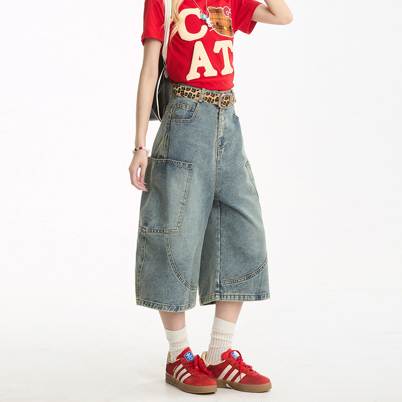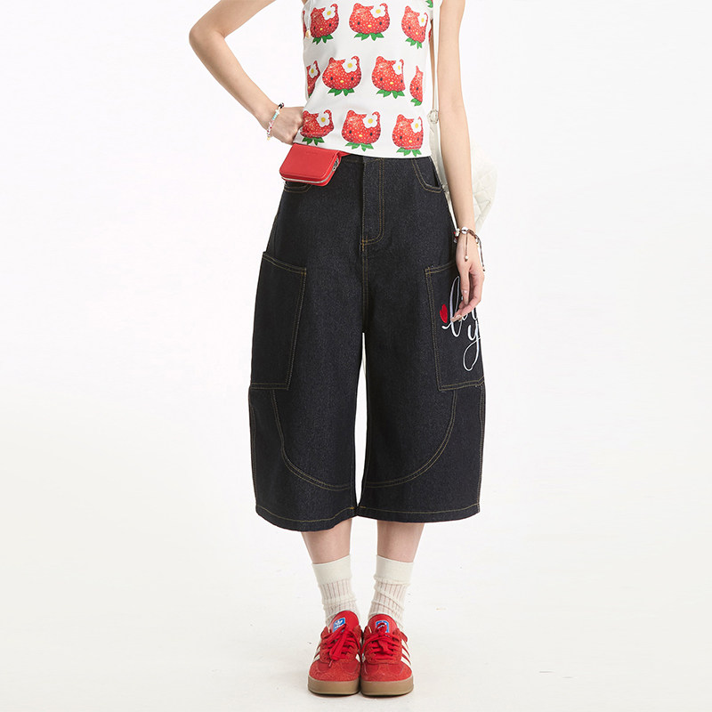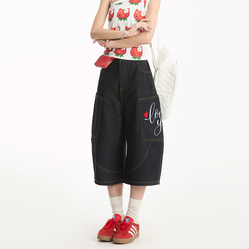 复古设计感休闲阔腿短裤 美式 女夏季 NERESUM爱心刺绣牛仔七分裤